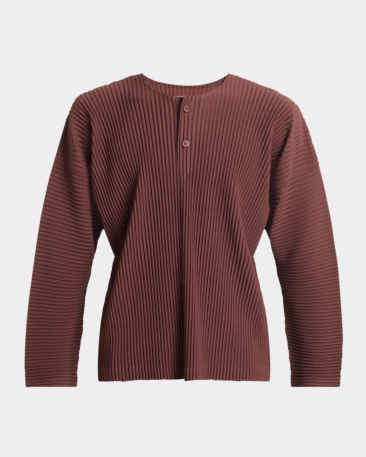 - Homme Plisse Issey Miyake henley shirt with allover pleating - Round neckline; two-button placket - Long sleeves - Boxy, slightly cropped fit - Pullover style - Polyester - Unlined - Machine wash cold, line dry - Made in Japan