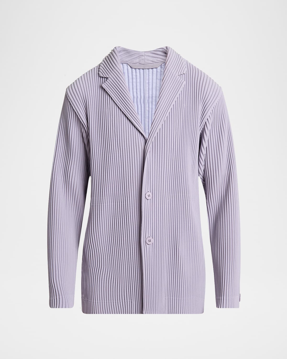 - Homme Plisse Issey Miyake sport coat defined by pleating for a sleek and defined finish - Notched lapels - Single-breasted front - Tonal buttons - Long sleeves - Single-button cuffs - Tailored fit - Polyester - Lining: Polyester - Do not iron, machine wash cold, line dry - Imported