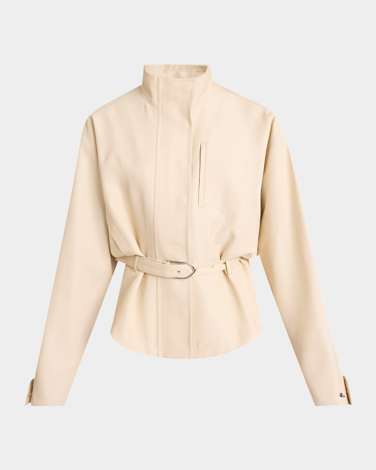 Jacquemus "Ciro" jacket High neckline; concealed placket Long sleeves; button cuffs Chest pocket Belted waist Fitted Polyester/virgin wool Viscose/cotton lining Made in Bulgaria