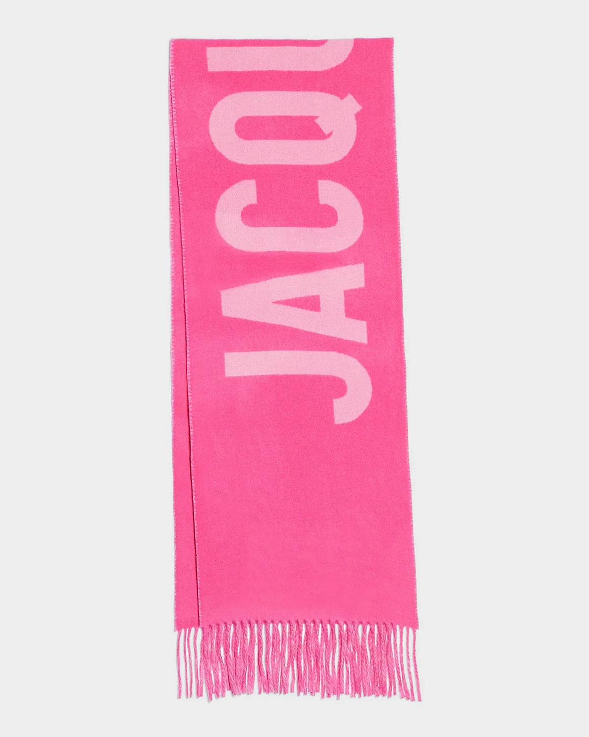 Jacquemus wool fringe scarf featuring a bold jacquard logo. Approx. 14"W x 71"L Fringing at ends May be styled multiple ways Virgin wool Made in Italy
