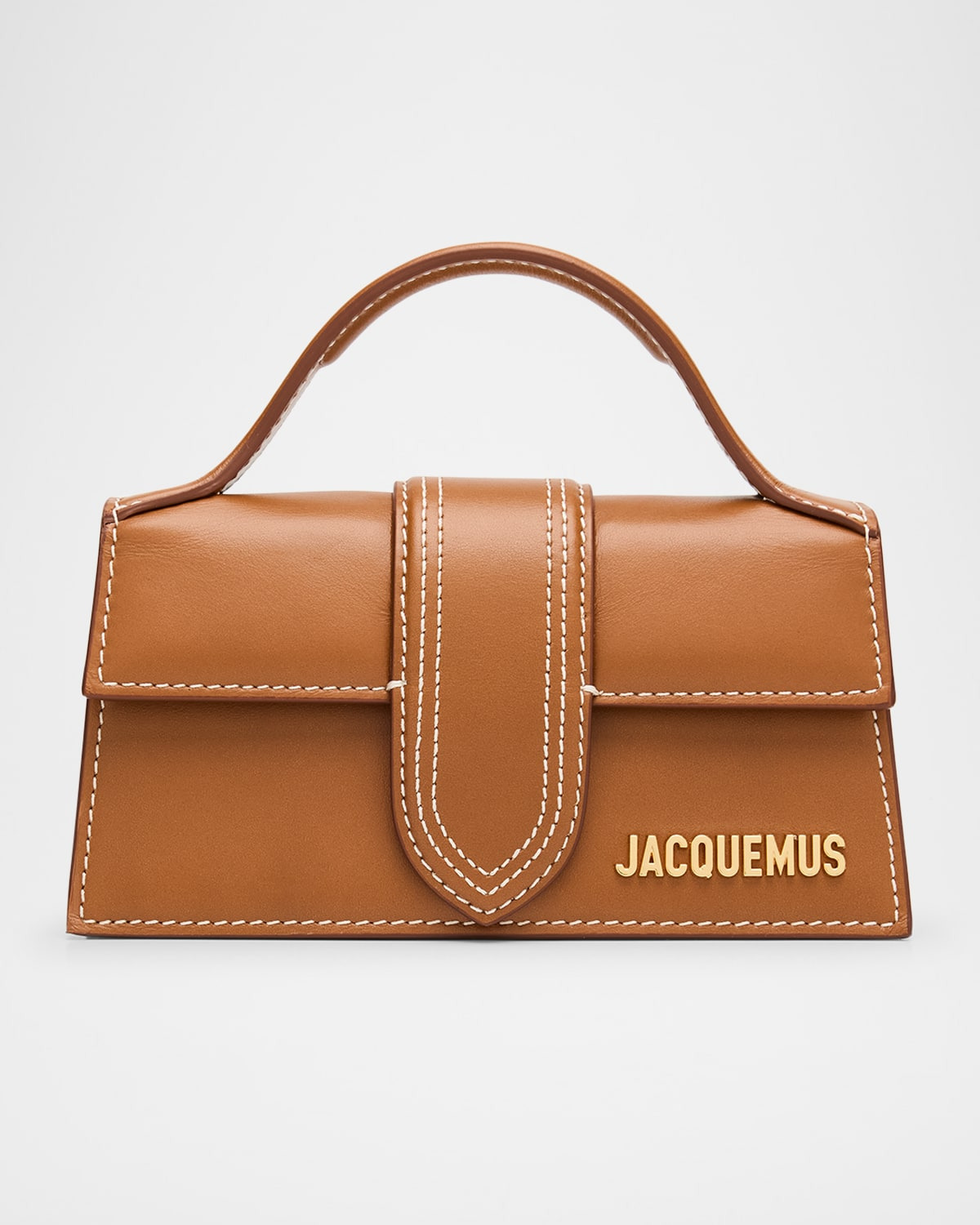 - Jacquemus "Le Bambino" shoulder bag in supple leather with contrast topstitching - Features signature logo lettering on corner - Flat top handle - Detachable, adjustable crossbody strap - Flap top with magnetic closure - Exterior, back slip pocket - Interior, one slip pocket - Lining: Cotton - Approx. 5.5"H x 6.8"W x 3.5"D - Made in Australia