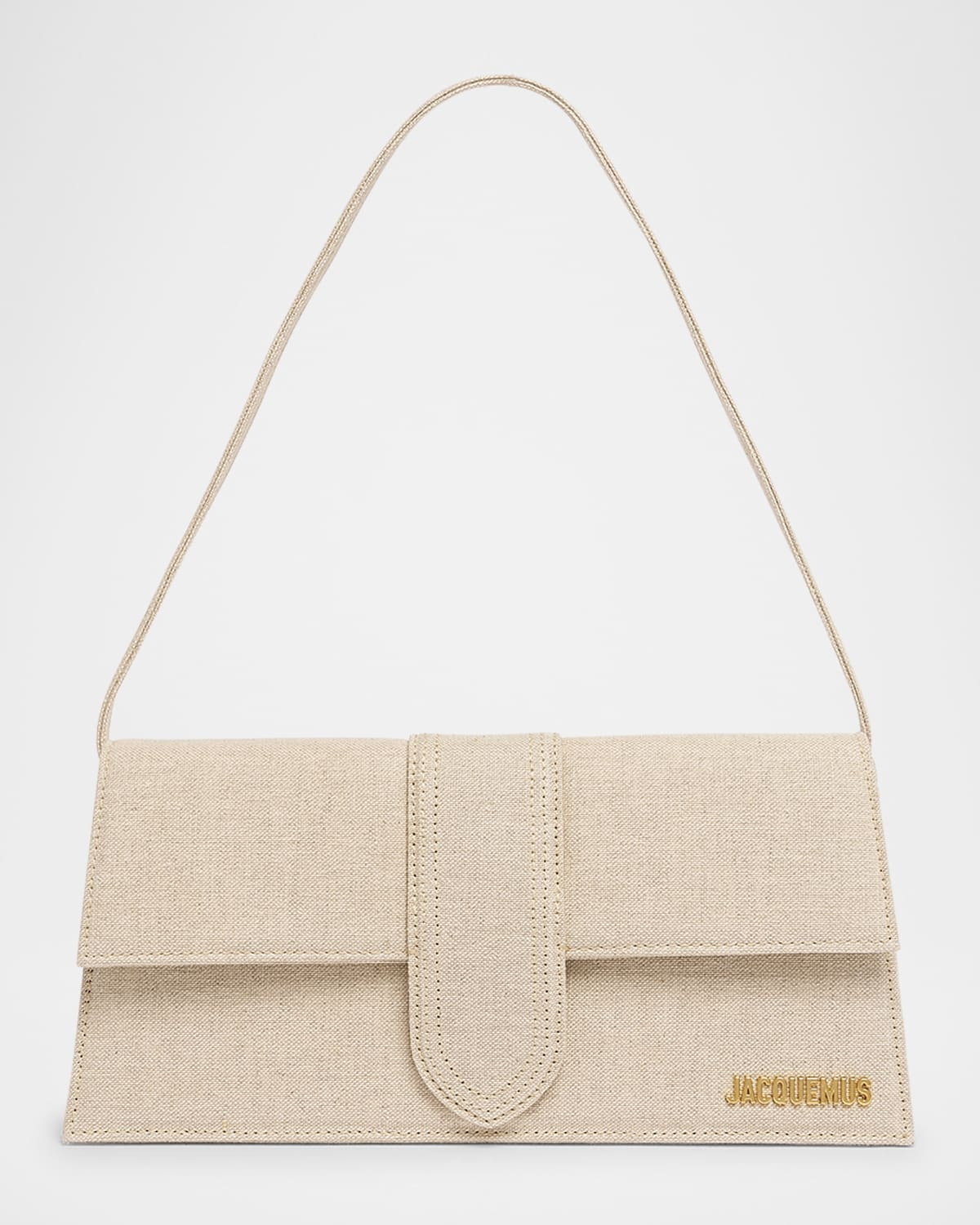 - Jacquemus "Le Bambino Long" shoulder bag in smooth calf leather, cotton, and zinc alloy hardware - Features logo lettering on front - Flat shoulder strap - Flap top with magnetic closure - Exterior, back slip pocket - Interior, one slip pocket - Lining: Cotton - Approx. 5.5"H x 11"W x 2.3"D - Made in Italy
