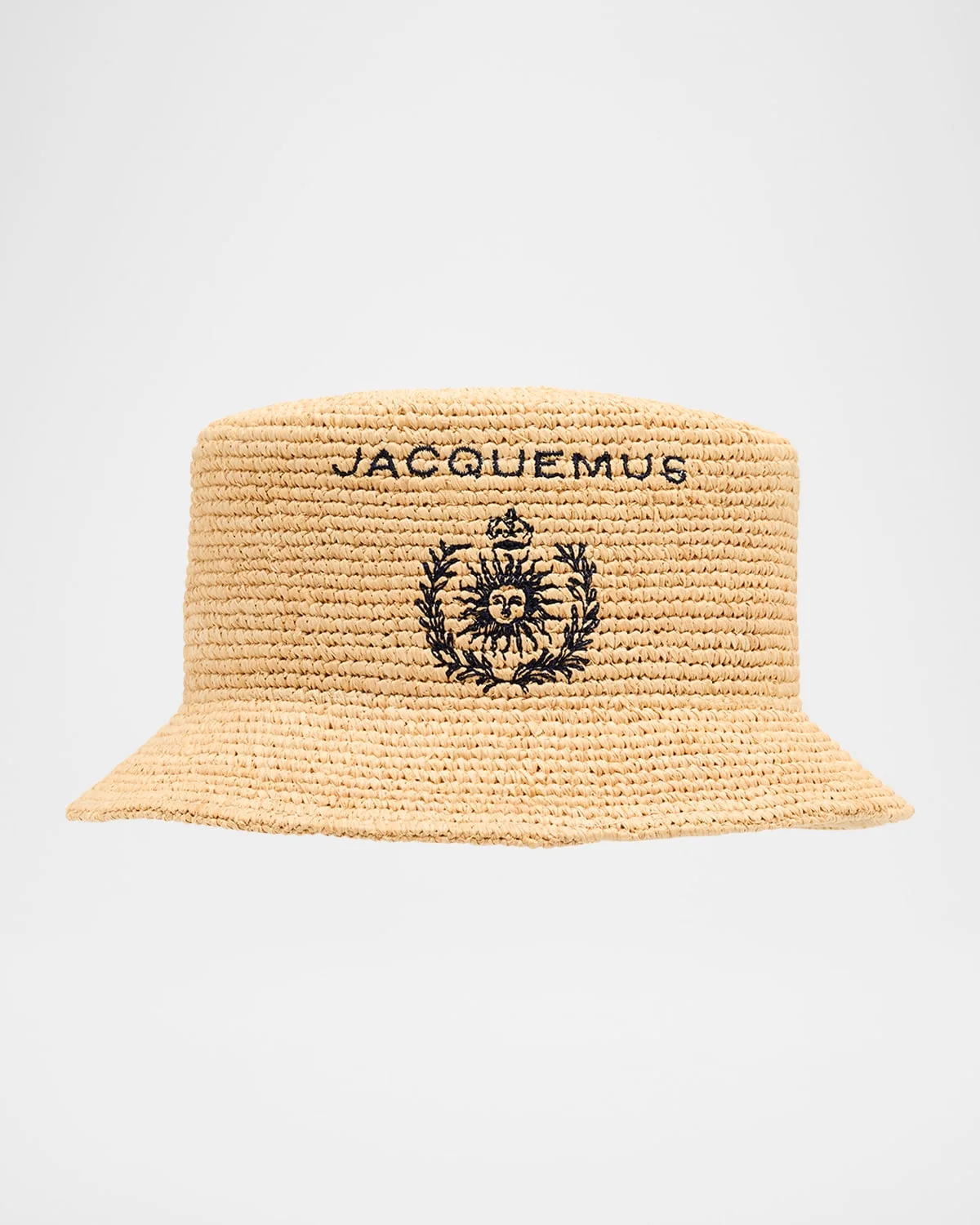 Jacquemus "Le Bob" straw woven bucket hat featuring the brand's logo motif on the front Flat crown Downturned brim Raffia Made in Italy
