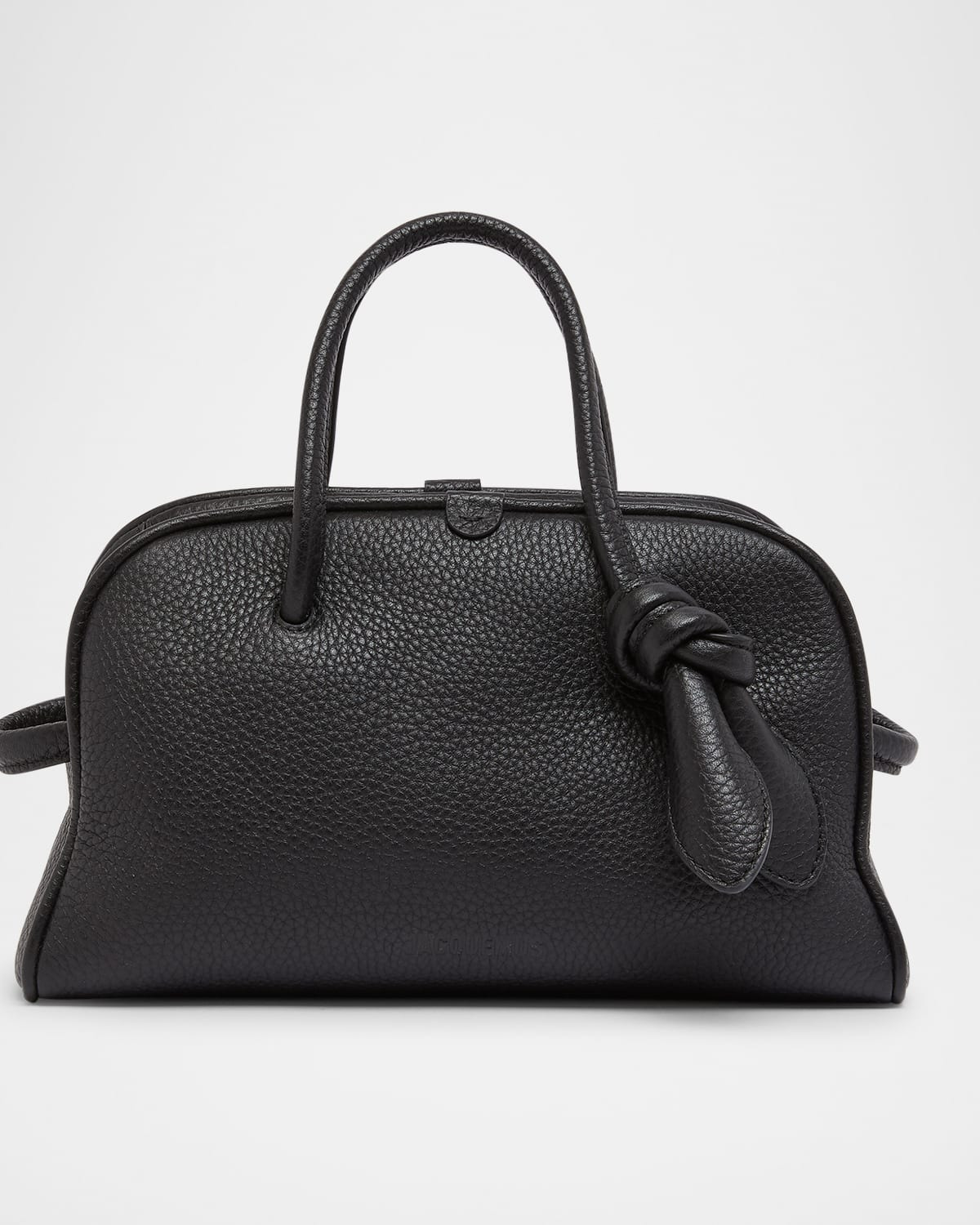 - Jacquemus "Le Petit Turismo" top handle bag in leather - Rolled top handles - Removable, adjustable shoulder strap - Can be worn as a top handle, shoulder, or crossbody bag - Zip top closure - Lining: Cotton - Approx. 6.3"H x 9.8"W x 4.3"D - Made in Italy