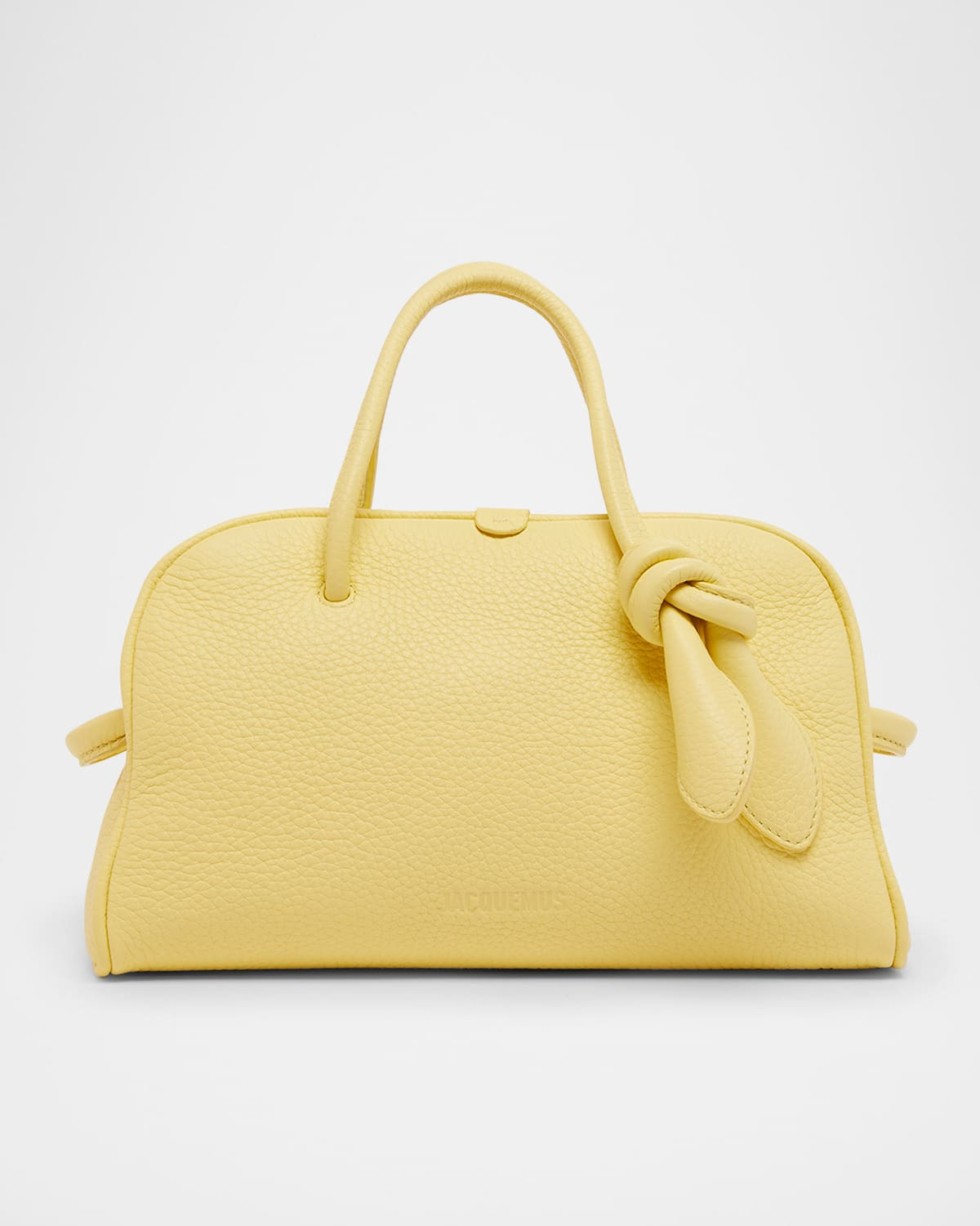 - Jacquemus "Le Petit Turismo" top handle bag in leather - Rolled top handles - Removable, adjustable shoulder strap - Can be worn as a top handle, shoulder, or crossbody bag - Zip top closure - Lining: Cotton - Approx. 6.3"H x 9.8"W x 4.3"D - Made in Italy