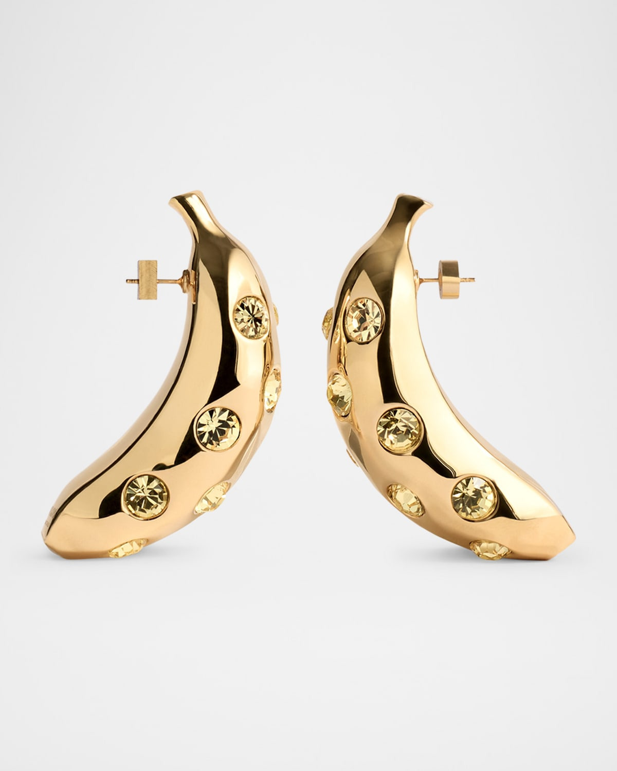 - Banana stud earrings by Jacquemus - Gold-tone copper and brass with a smooth finish - Inlaid rhinestones - Engraved circle and square push-backs - For pierced ears - Made in Italy