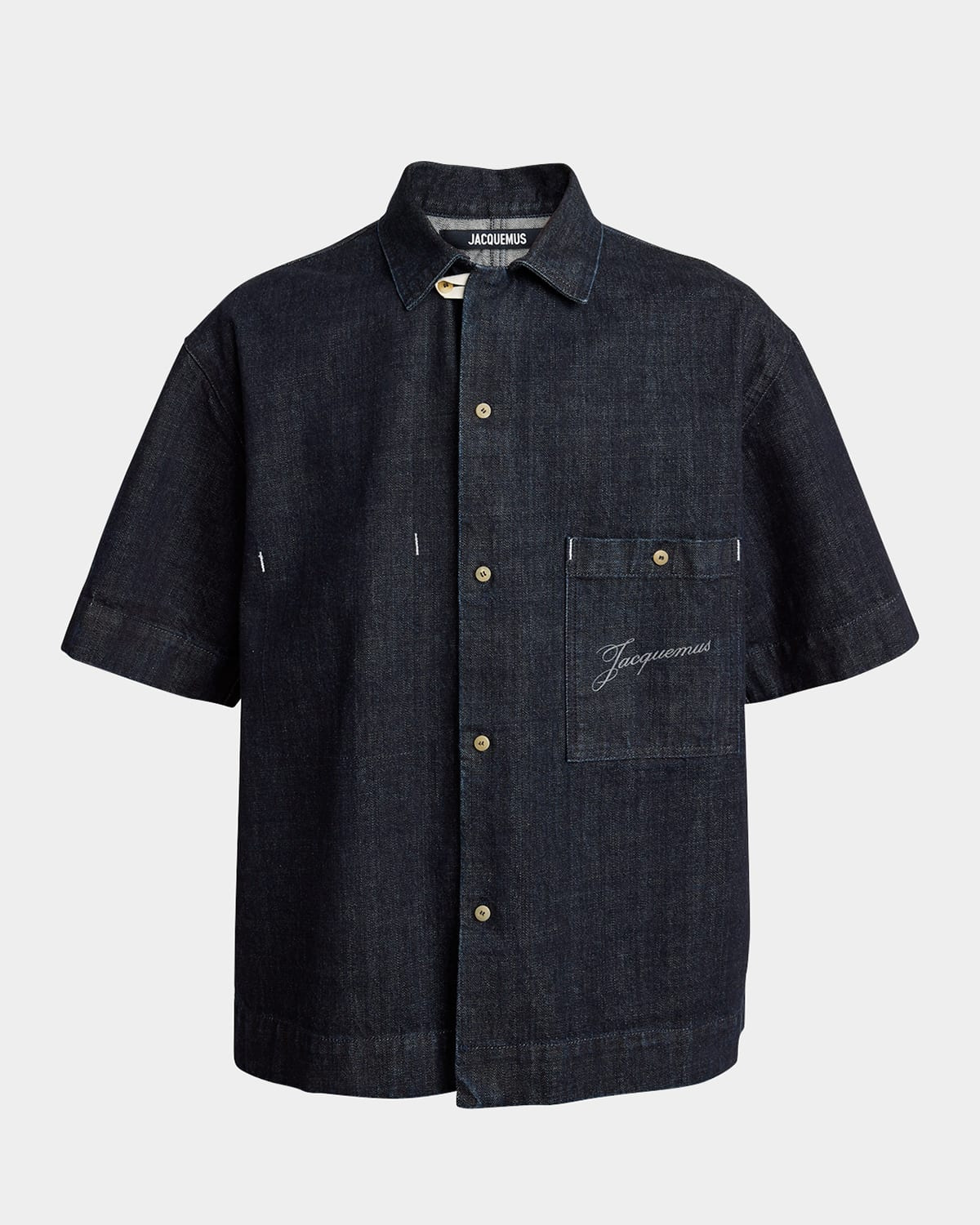 Jacquemus shirt crafted from raw denim Point collar Button front closure Chest pocket with logo script Short sleeves Boxy fit Cotton Made in Italy