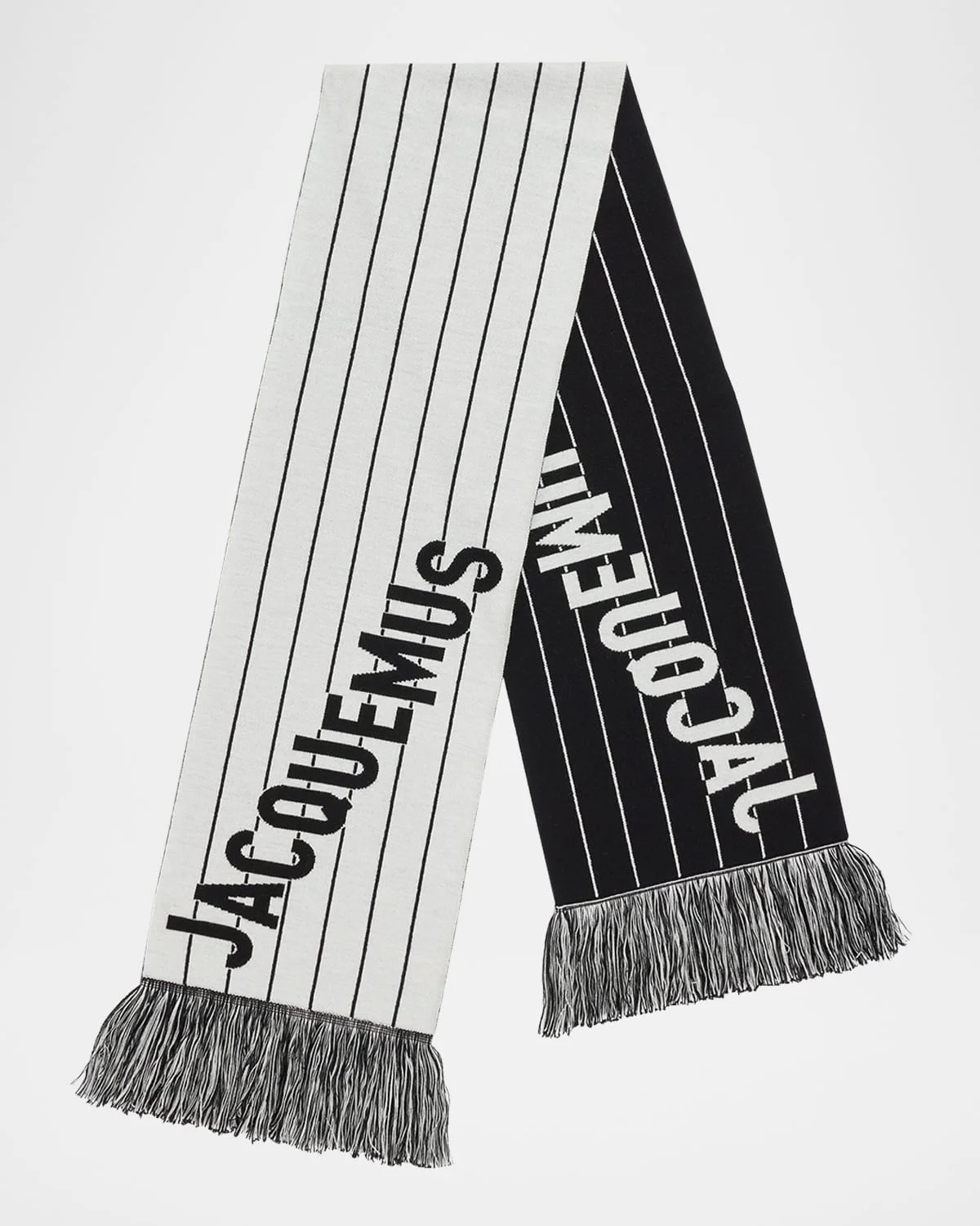 An elevated take on classic kntwear, this monochromatic Jacquemus knit scarf showcases a striped pattern with the brand's logo. Fringed edges May be styled multiple ways Wool/nylon/polyamide Made in Italy