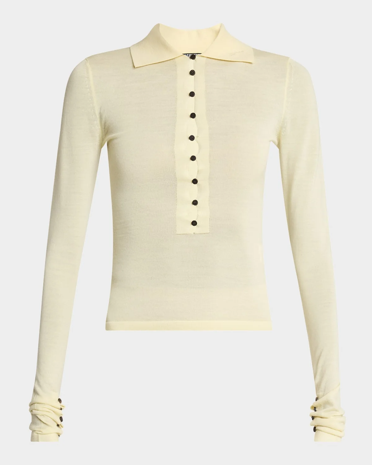 - Jacquemus fine merino wool polo top - Point collar; button-placket - Long sleeves with button cuffs - Fitted - Hem sits at the hip - Merino wool/nylon/polyamide - Imported