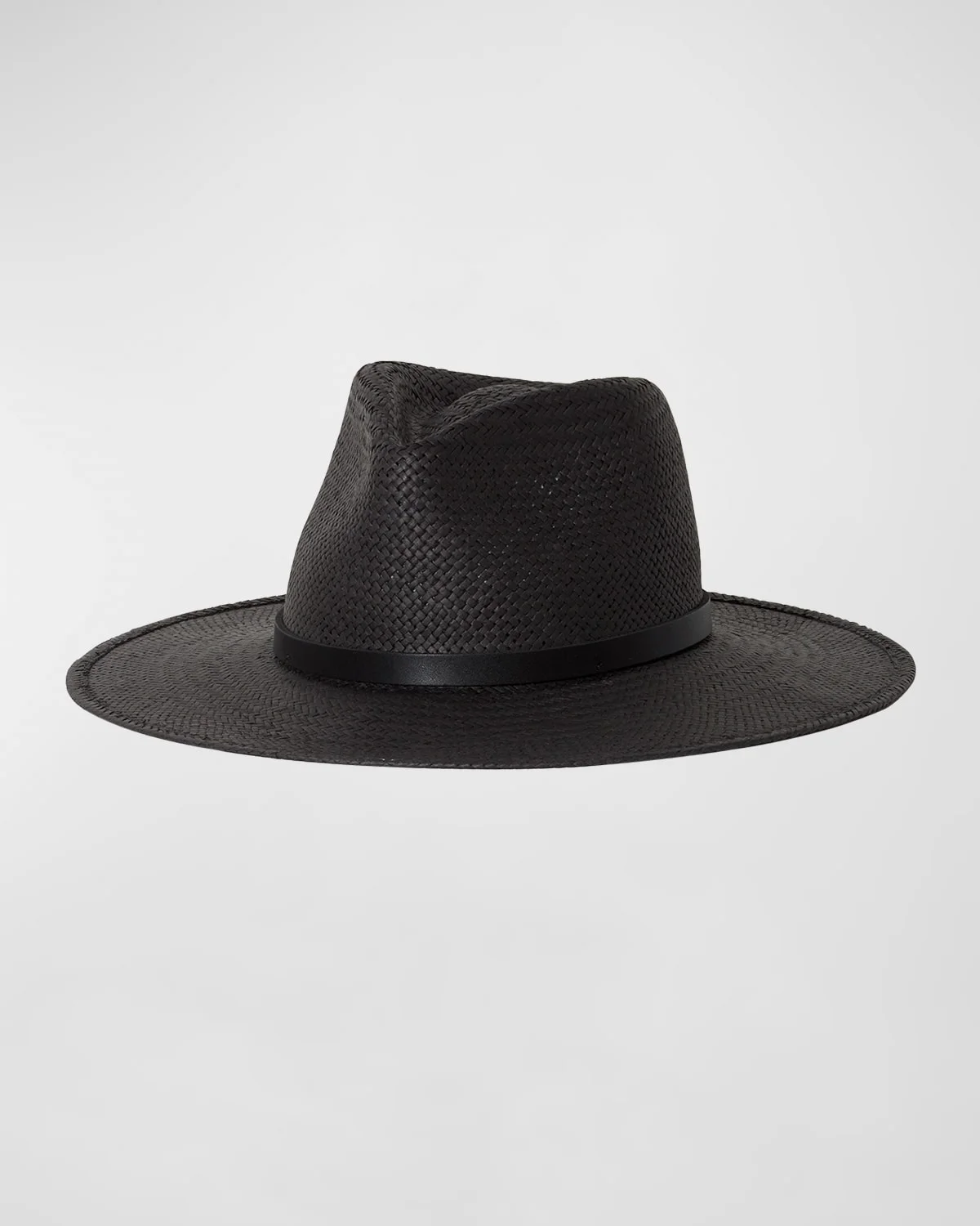 - Janessa Leone "Sherman" packable fedora hat - Approx. 3.5"L x 4"H - Dented crown - Flat brim - Strap at break with golden screw closure - Paper/calf leather/acrylic - Spot clean - Made in USA