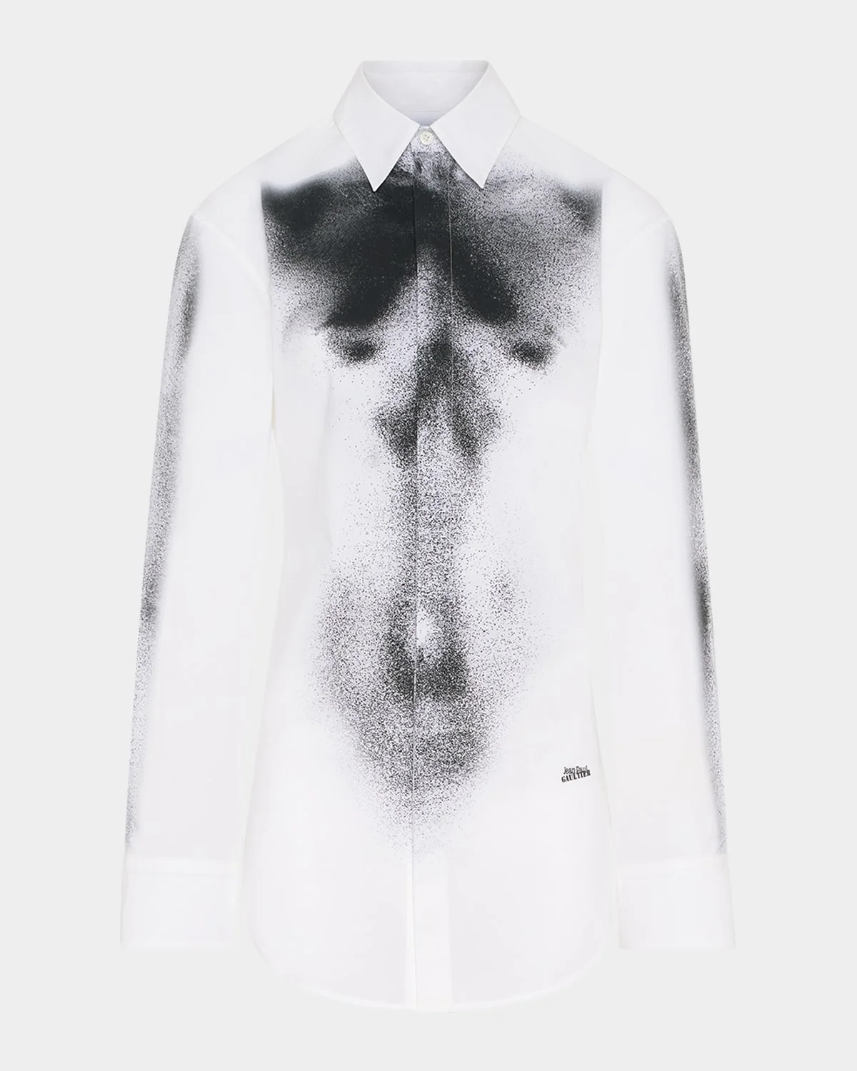 Jean Paul Gaultier shirt is crafted of a crisp cotton poplin featuring a Body Dust printed front and a logo stamp print on the hip Point collar; concealed button front Long sleeves; button cuffs Regular fit Shirttail hem Cotton/elastane Made in Portugal