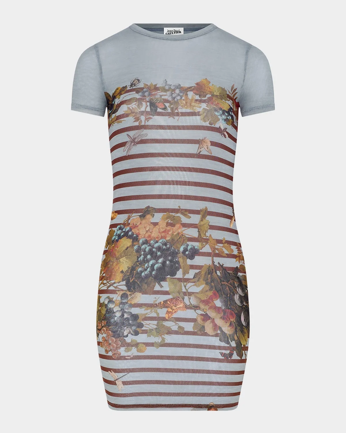 Crafted from mesh, this dress & nbsp;from Jean Paul Gaultier features a mariniere grapes print Round neckline Short sleeves Body-conscious silhouette Mini length Slipover style Nylon/polyamide Made in Italy