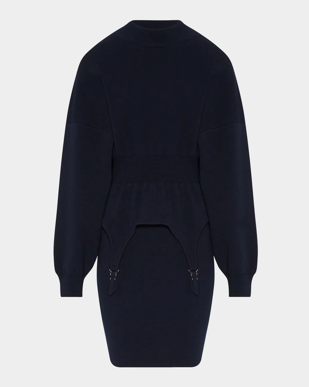 Jean Paul Gaultier sweater dress is crafted of ribbed knit featuring a cinched waist with a harness peplum detail Mock neckline Long sleeves Drop shoulders Sheath silhouette Hem falls below the knee Ribbed cuffs and hem Slipover style Viscose/nylon/polyamide Made in Italy