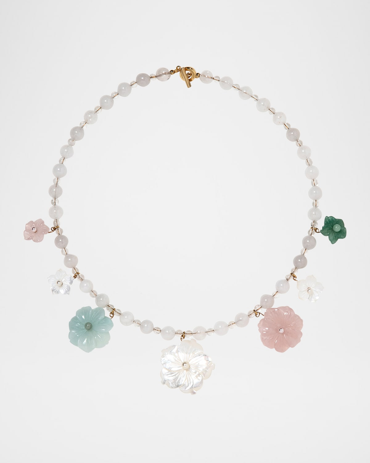 - Jennifer Behr "Avani" necklace adorned with quartz beads and seven carved charms - Necklace length: approx. 18 inches - 18-karat gold-plated brass hardware - Semi-precious aventurine, rose quartz and mother-of-pearl flower-shaped pendants - Adjustable length - Toggle clasp - Made in USA