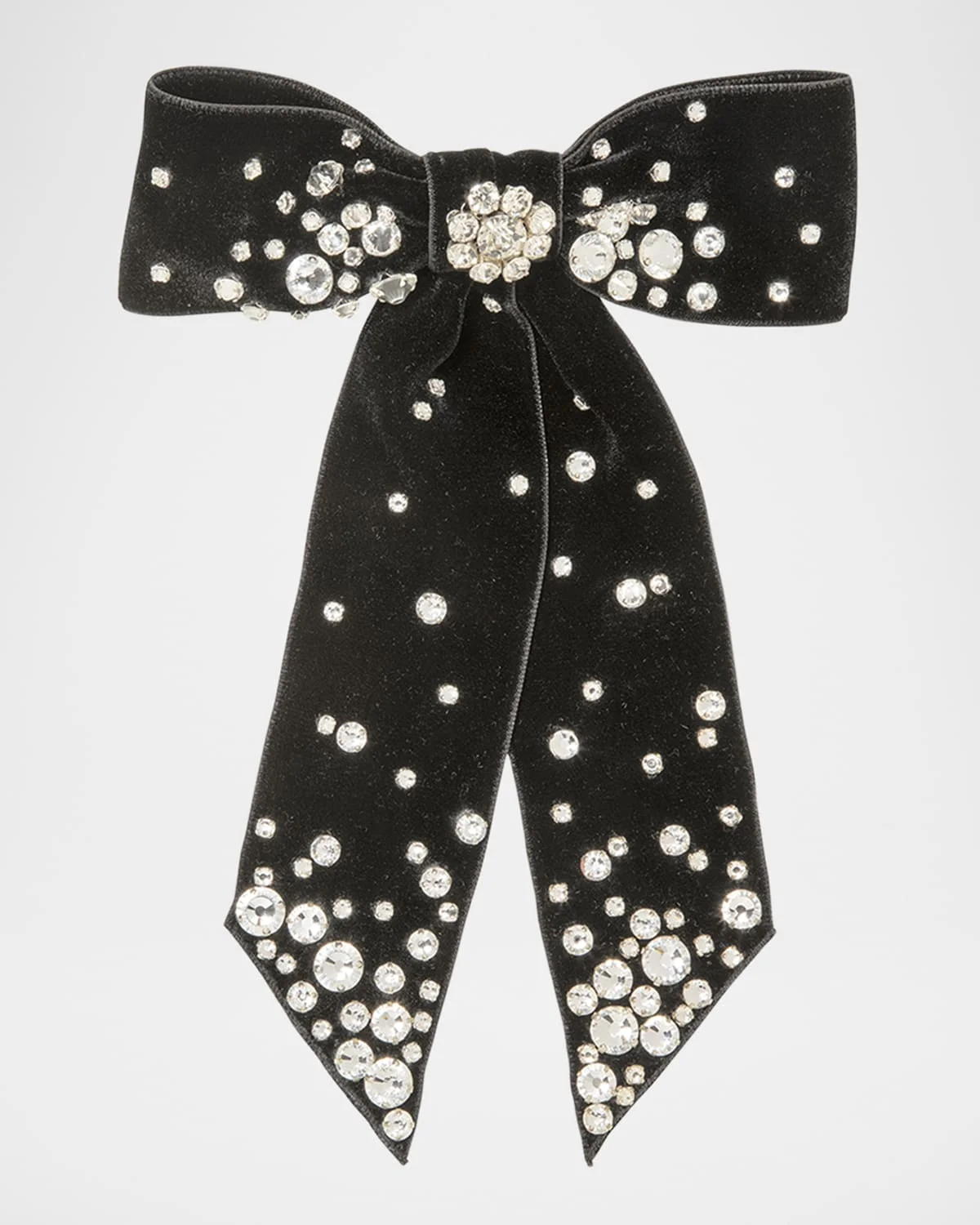 - Jennifer Behr "Isabelle" barrette features hand-embroidered gem-cut Czech crystals on a silk velvet bow - Approx. 9"L x 6.0"W - French barrette closure - Silkette® viscose/crystals/steel - Made in USA