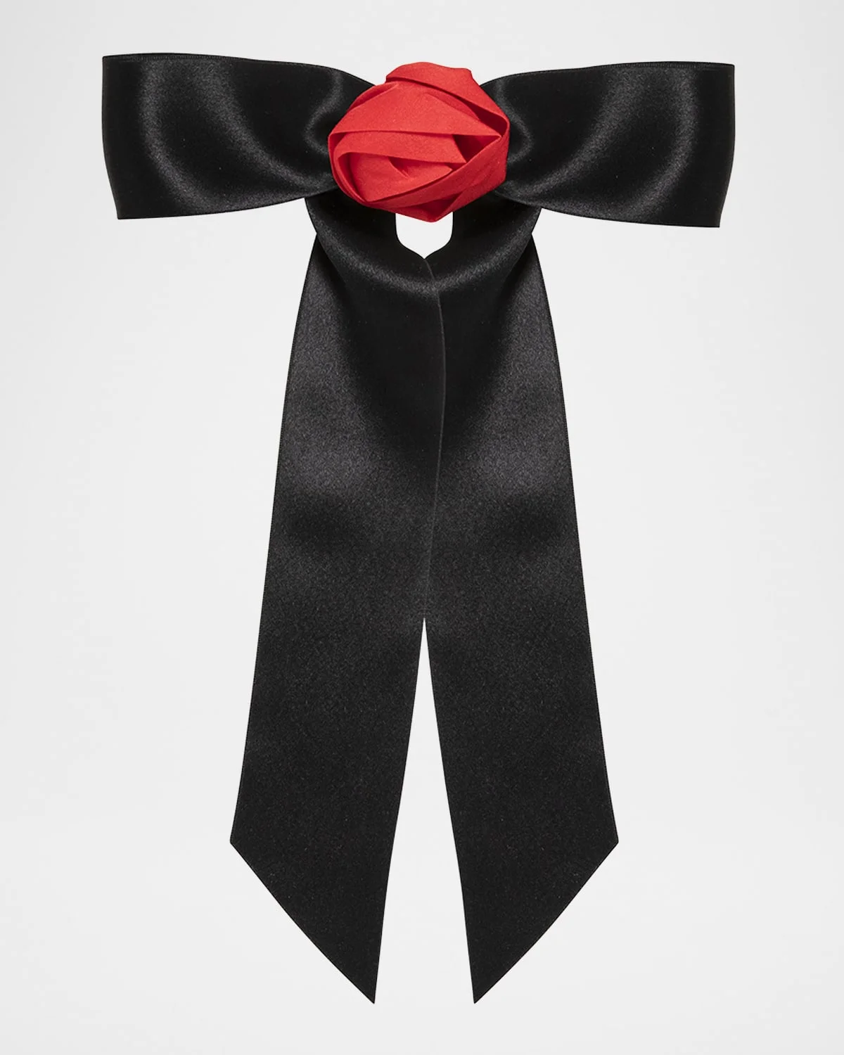 - We recommend treating this accessory as you would a piece of jewelry, and storing it in the dust bag when not in use. Avoid contact with water, perfume, and other chemicals, including hairspray, which should be used before placement in the hair. - Jennifer Behr silk bow barrette with contrast rossette - Approx. 10"L x 7.5"W - French barrette closure - Silk - Made in USA