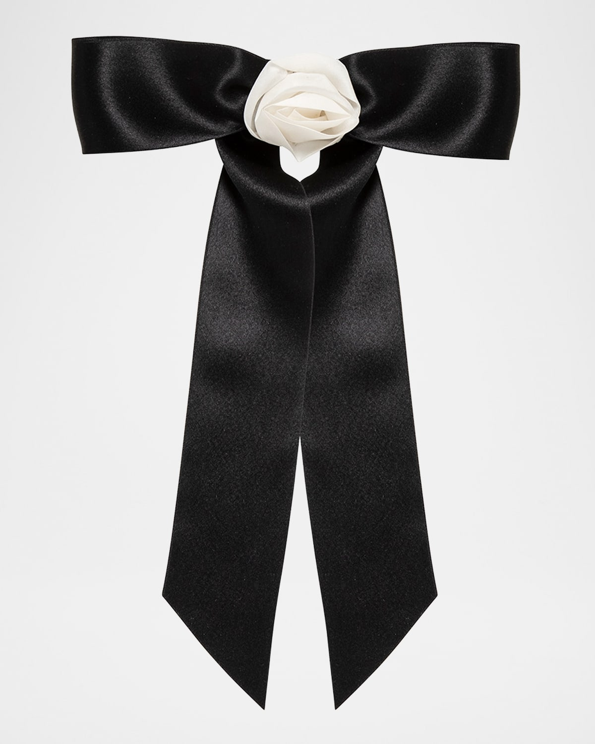 - We recommend treating this accessory as you would a piece of jewelry, and storing it in the dust bag when not in use. Avoid contact with water, perfume, and other chemicals, including hairspray, which should be used before placement in the hair. - Jennifer Behr silk bow barrette with contrast rossette - Approx. 10"L x 7.5"W - French barrette closure - Silk - Made in USA