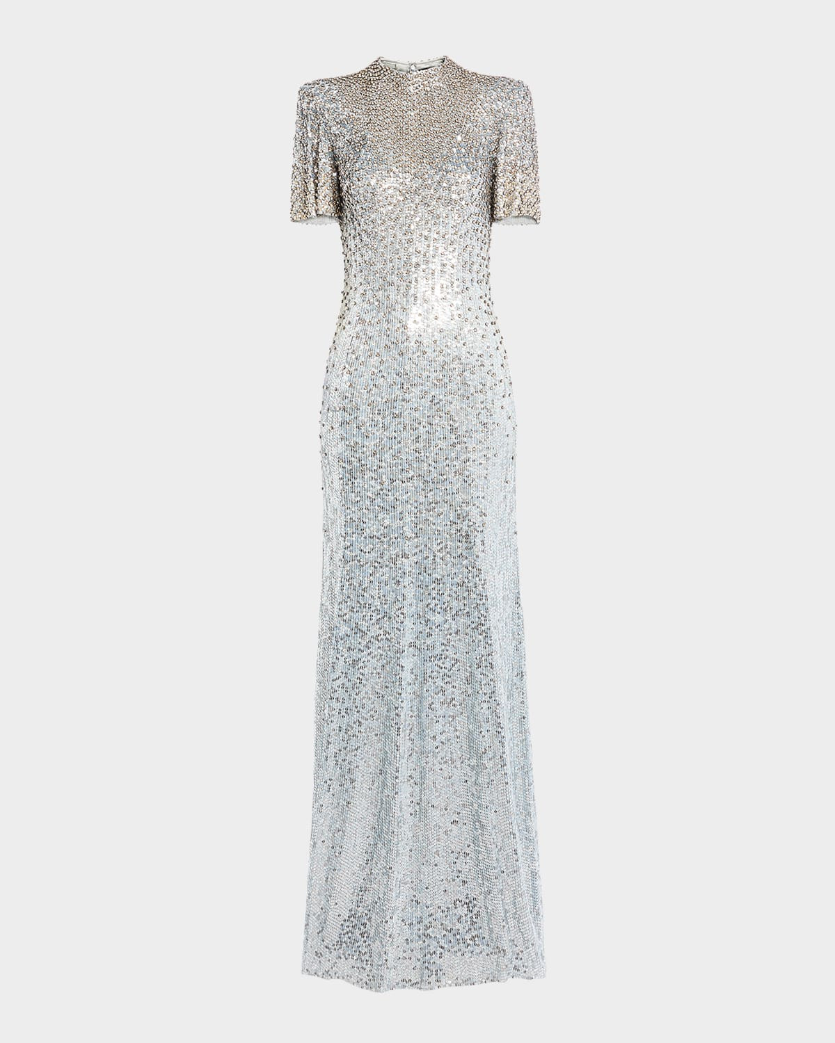- Jenny Packham "Jourdain" sequined gown embellished in degrade crystal embroidery - High neckline - Short flutter sleeves - Columnn silhouette - Floor length - Back zip - Viscose/polyester - Imported