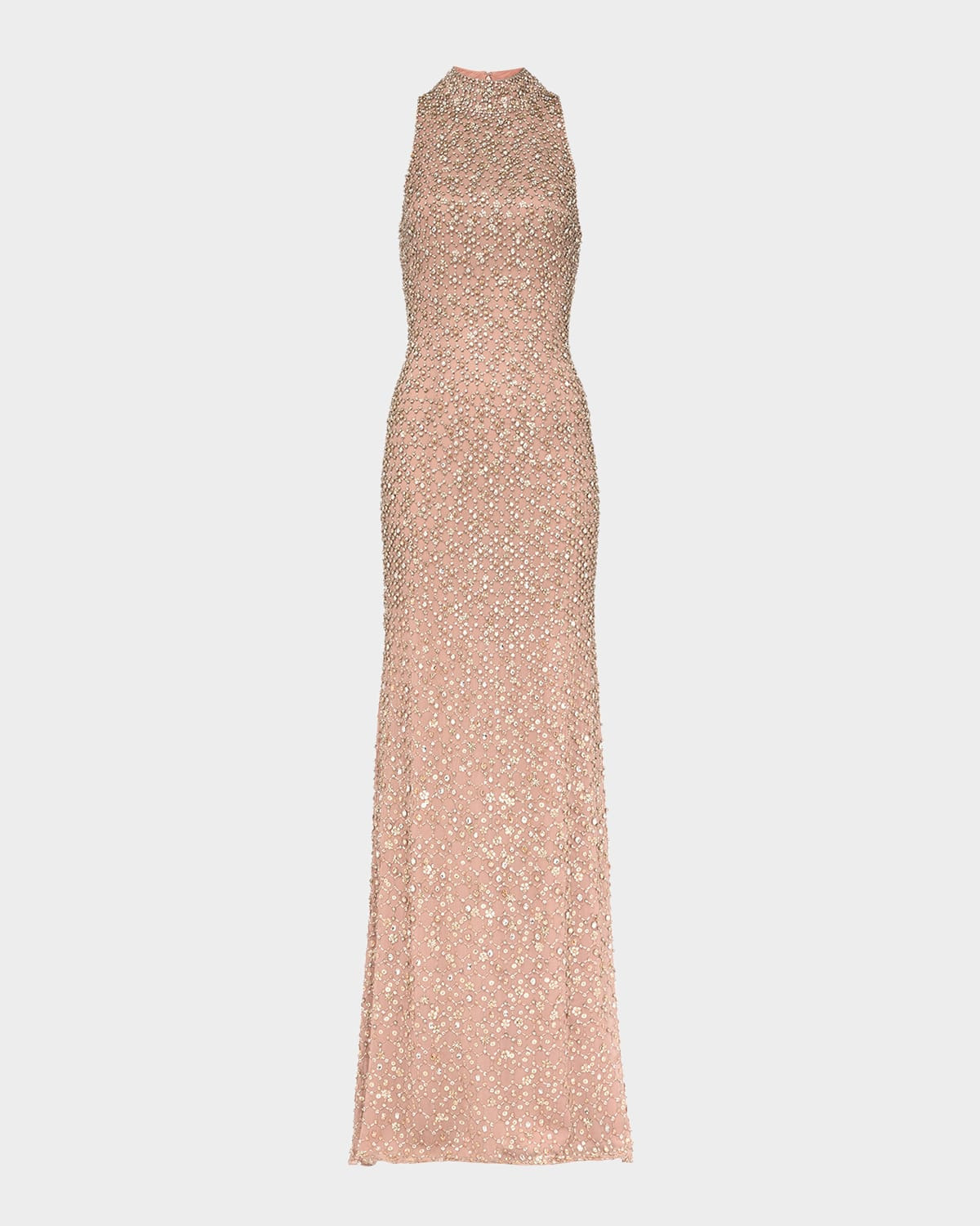 Jenny Packham "Juno" gown embellished in allover crystal embroidery Approx. 63"L from shoulder to hem Mock neckline Sleeveless Trumpet silhouette Floor sweeping hem Invisible back zip Silk/viscose Imported