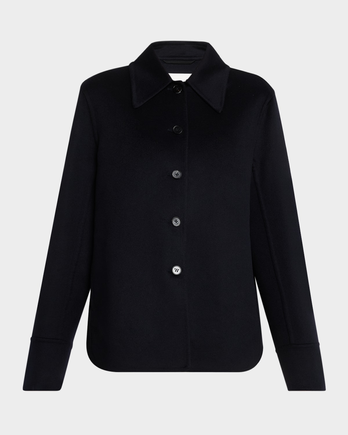 Jil Sander solid jacket Spread collar; button front Long sleeves; button cuffs Straight fit Curved hem Cashmere Dry clean Made in Italy
