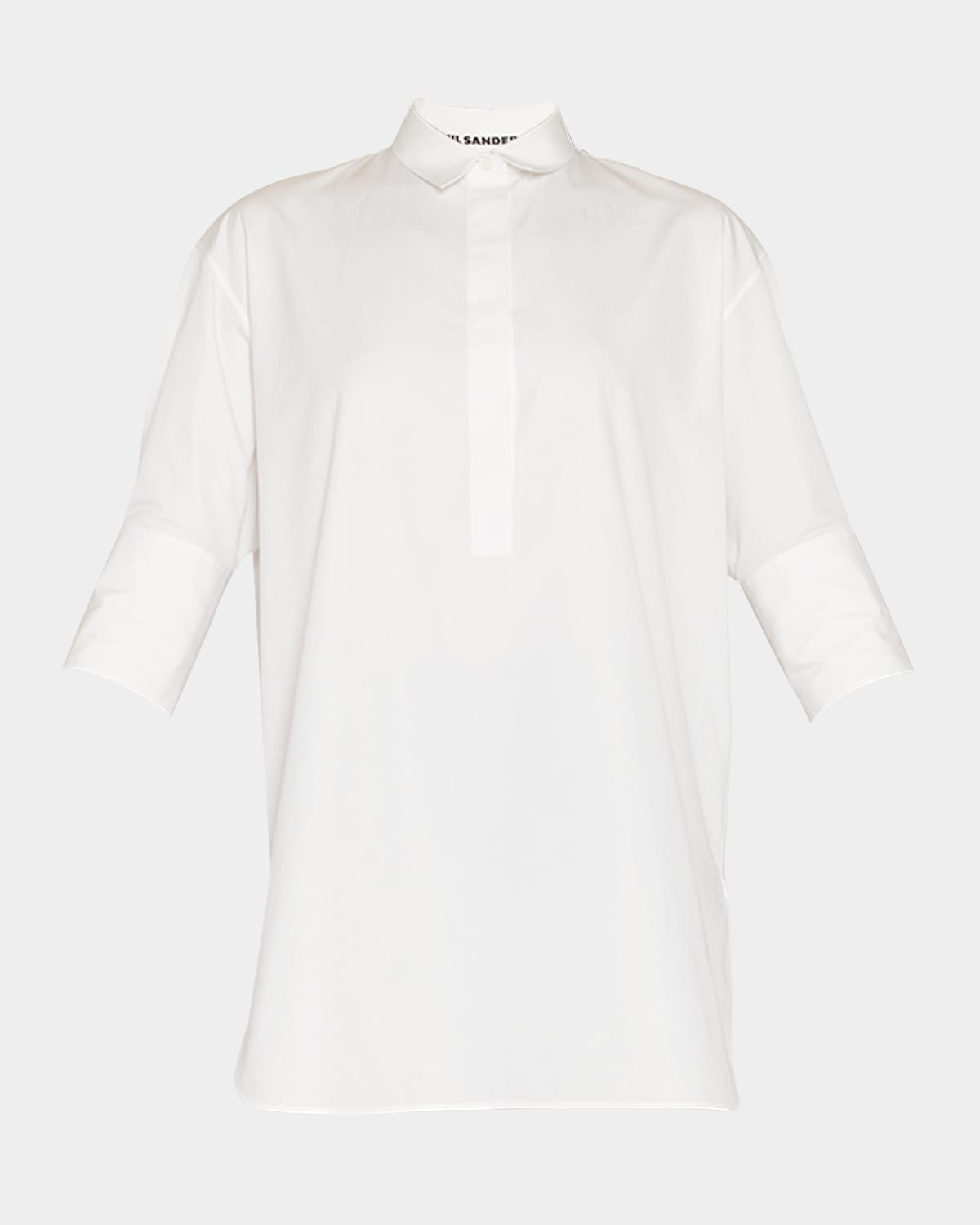 Jil Sander "Friday" relaxed cotton shirt in a half buttonfront styling Point collar 3/4 sleeves; volume style Shirttail hem; side slits Midlength Loose fit Cotton Made in Italy