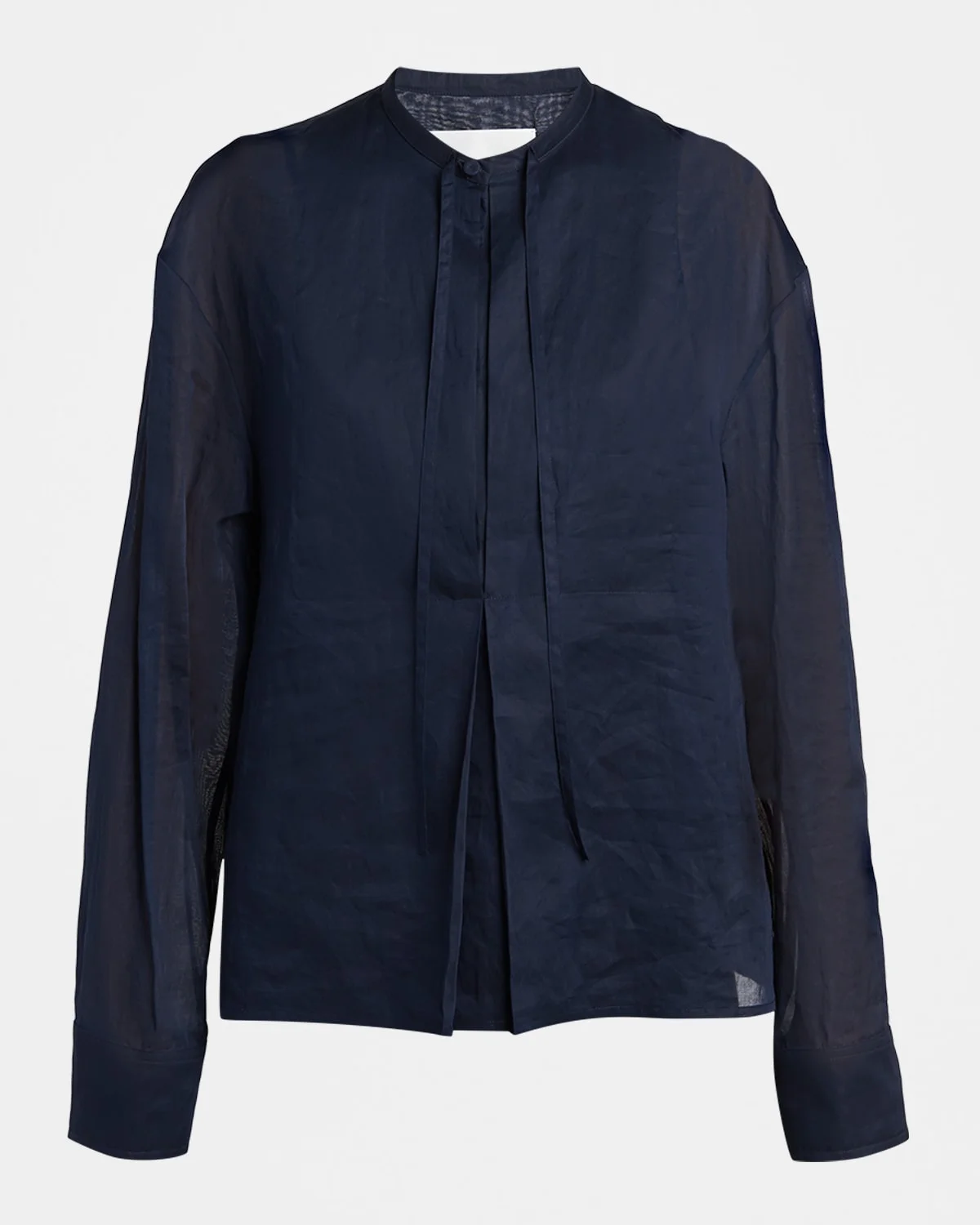 Jil Sander blouse is crafted glass cotton organza accented with a front pleats and neck ties Band collar; concealed button front Long sleeves; button cuffs Loose fit Hip length Cotton Professional cleaning recommended Made in Italy