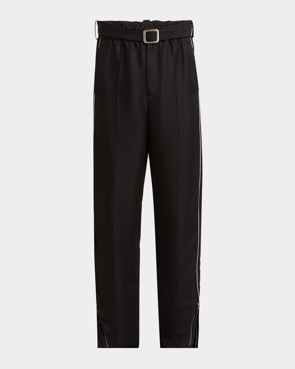 - Jil Sander trousers accented with a self-belt and contrast piping on the sides - Regular rise - Pintuck pleated front - Side on-seam pockets - Relaxed fit through straight legs - Full length - Elasticized waistband - Pull-on style - Viscose - Lining: Viscose - Dry clean - Made in Italy
