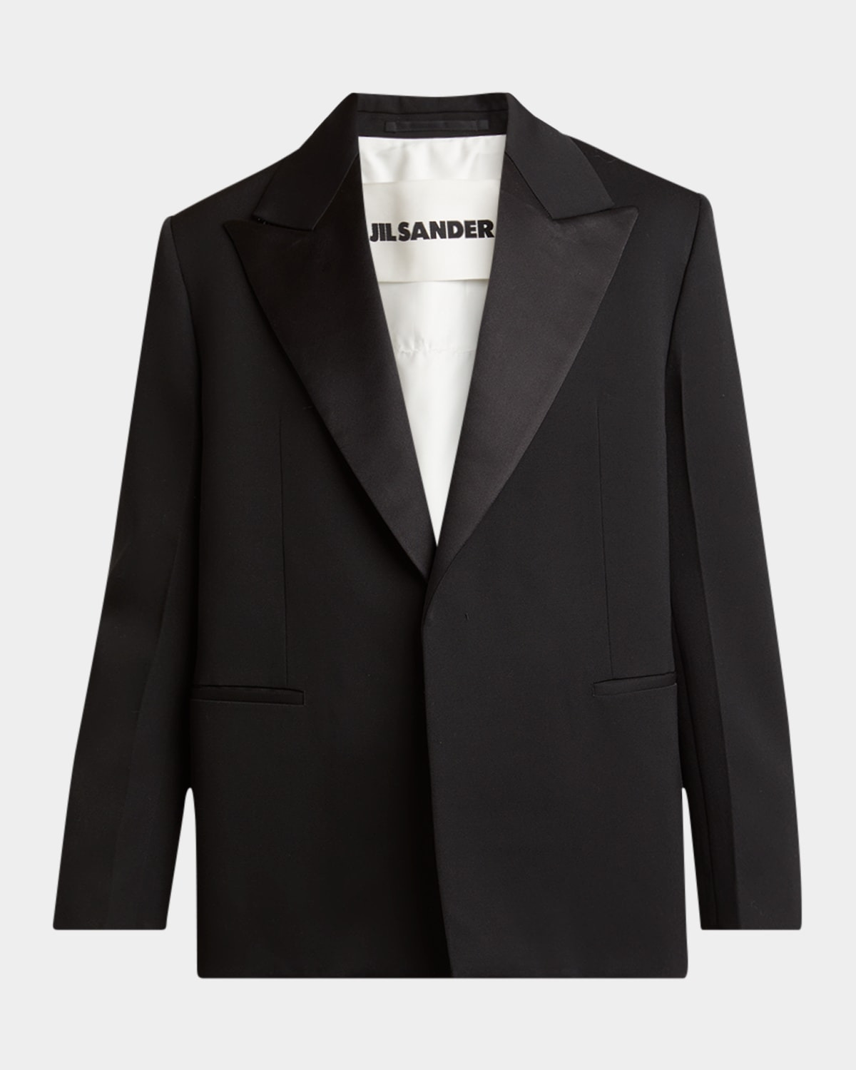 - Jil Sander evening jacket in wool accented with lustrous satin peak lapels for a subtle elegance - Concealed single-button front - Hip welt pockets - Long sleeves - Hidden button cuffs - Wool/silk - Lining: Viscose - Dry clean - Made in Italy