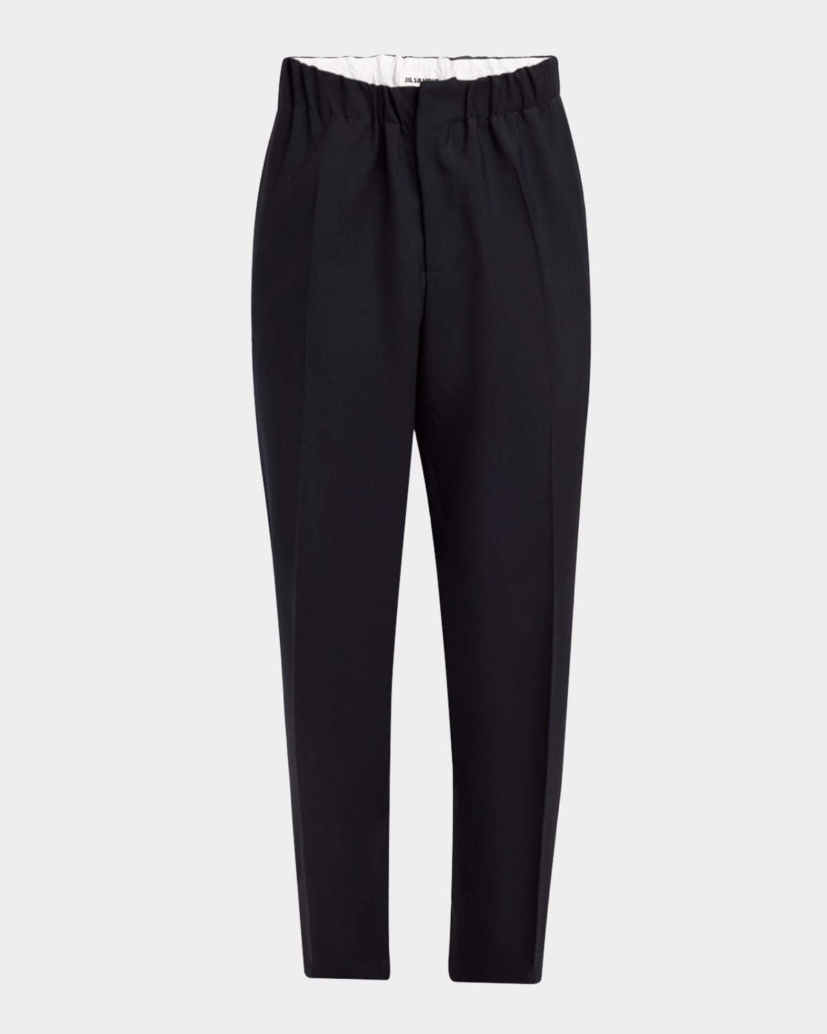 - Jil Sander trousers in wool defined by a comfortable elasticized waistband - Regular rise - Flat front - Side slip pockets - Back flap pockets - Tapered legs - Cropped fit - Hook-zip front - Wool - Lining: Cotton - Dry clean - Made in Italy