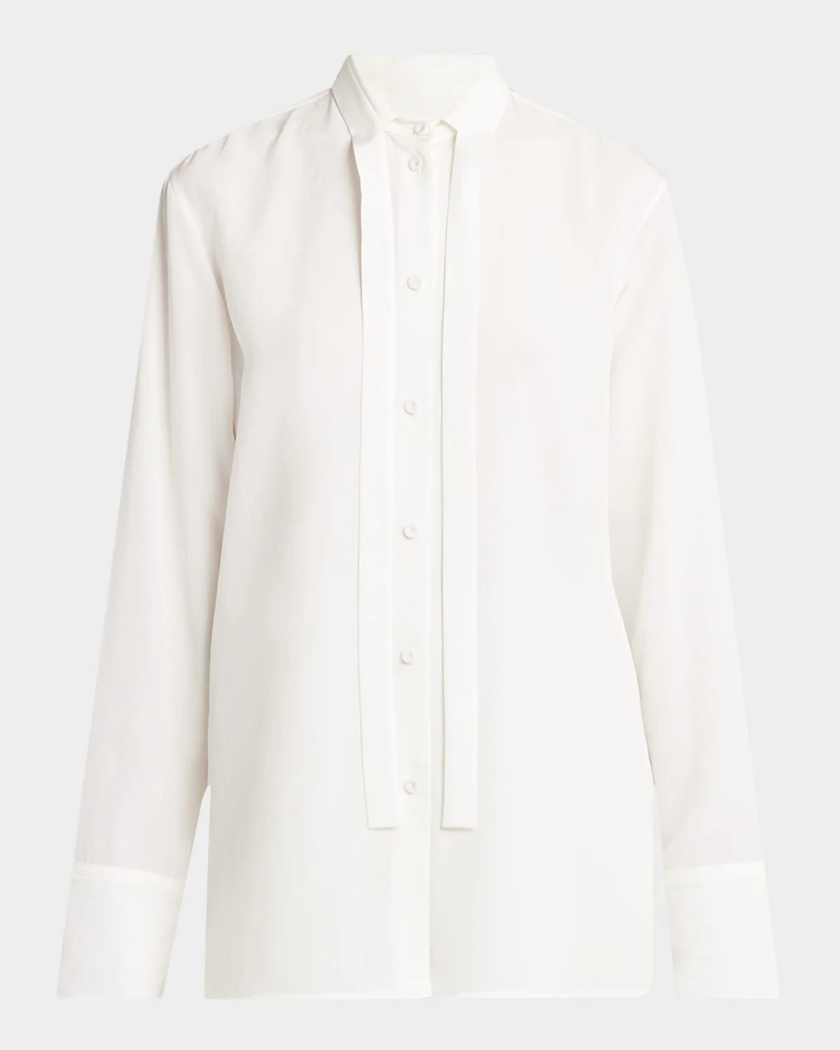 Jil Sander shirt featuring a neck tie Band collar; button front Long sleeves; button cuffs Loose fit Viscose/rayon/cellulose acetate/silk Dry clean Made in Italy