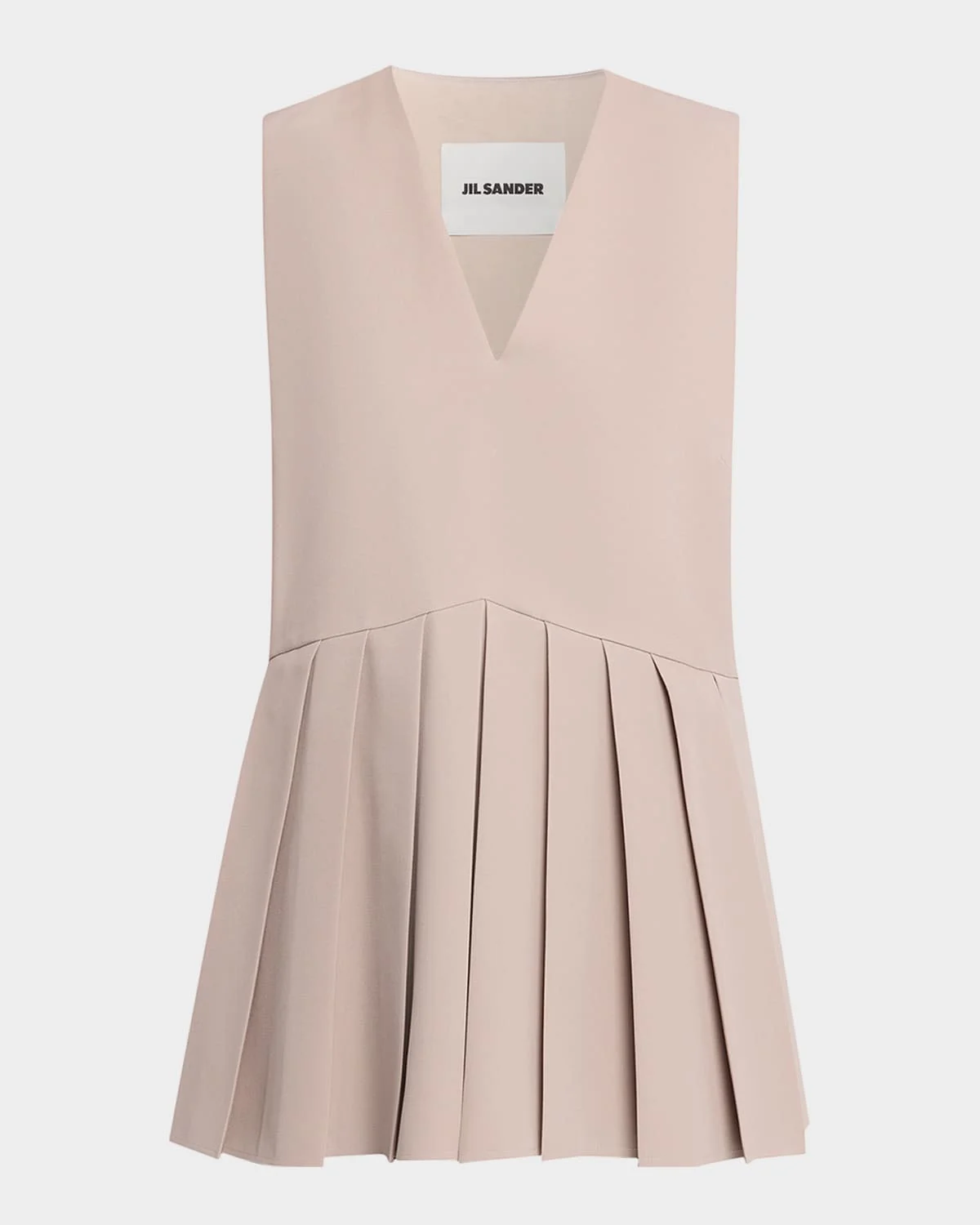 Jil Sander peplum top is crafted from a wool crepe, accentuating the waist with a pleated flounce hem and raw edges V neckline Sleeveless Relaxed fit Hip length Raw hem Invisible side zip Wool Professional cleaning recommended Made in Italy