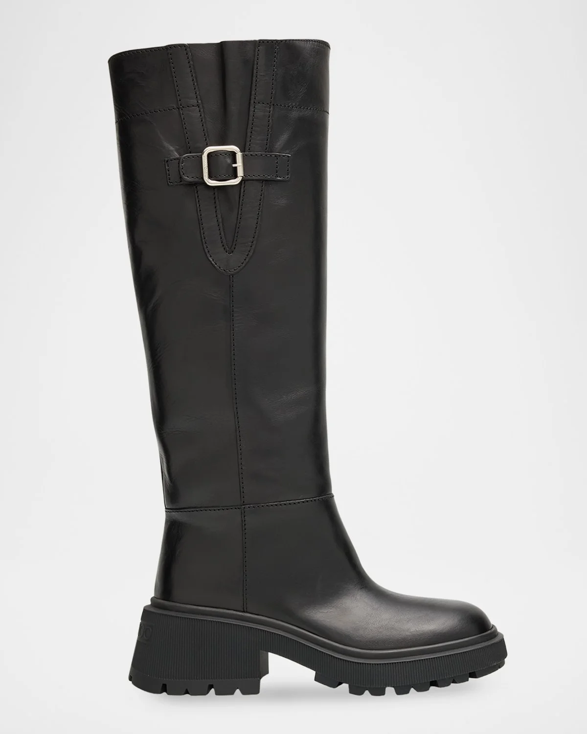 Tamsin Knee Boot Flat Black Shiny Calf Leather Knee High Boot