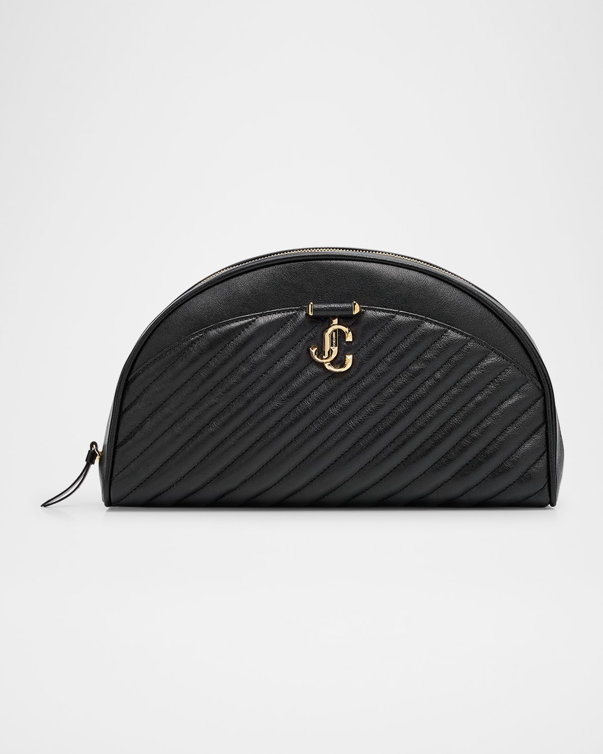 - Jimmy Choo "Avenue" curve pouch bag in fine grain leather with diagonal quilting - Zip top closure - Front metal logo - Interior, one slip pocket - Lining: Fabric - Trim: Leather - Approx. 6.7"H x 11.4"W x 2.8"D - Made in Italy