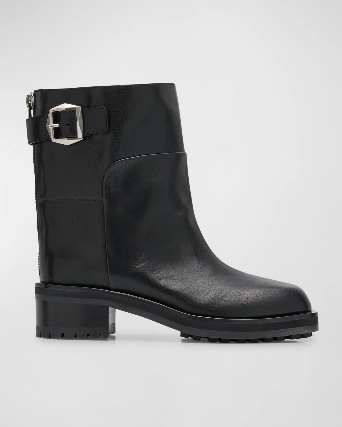 - Jimmy Choo "Brooklyn" smooth leather moto booties - 2.00 in / 50 mm block heel - Round toe - Buckle strap at collar - Back zip eases dress - Lugged Rubber outsole - Lining: Leather - Made in Italy - Size Note: Item runs small, consider ordering a size up.