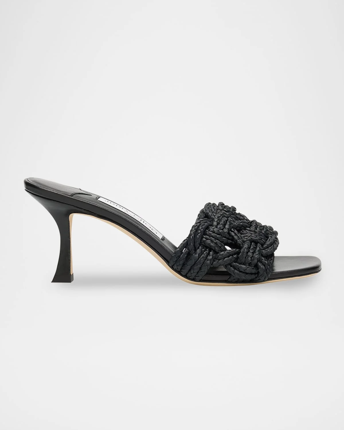 Jimmy Choo "Chara" sandals in nappa leather with a crochet raffia upper 2.75 in / 70 mm stiletto heel Squared open toe Wide band upper Slipon style Leather lining and outsole Made in Italy