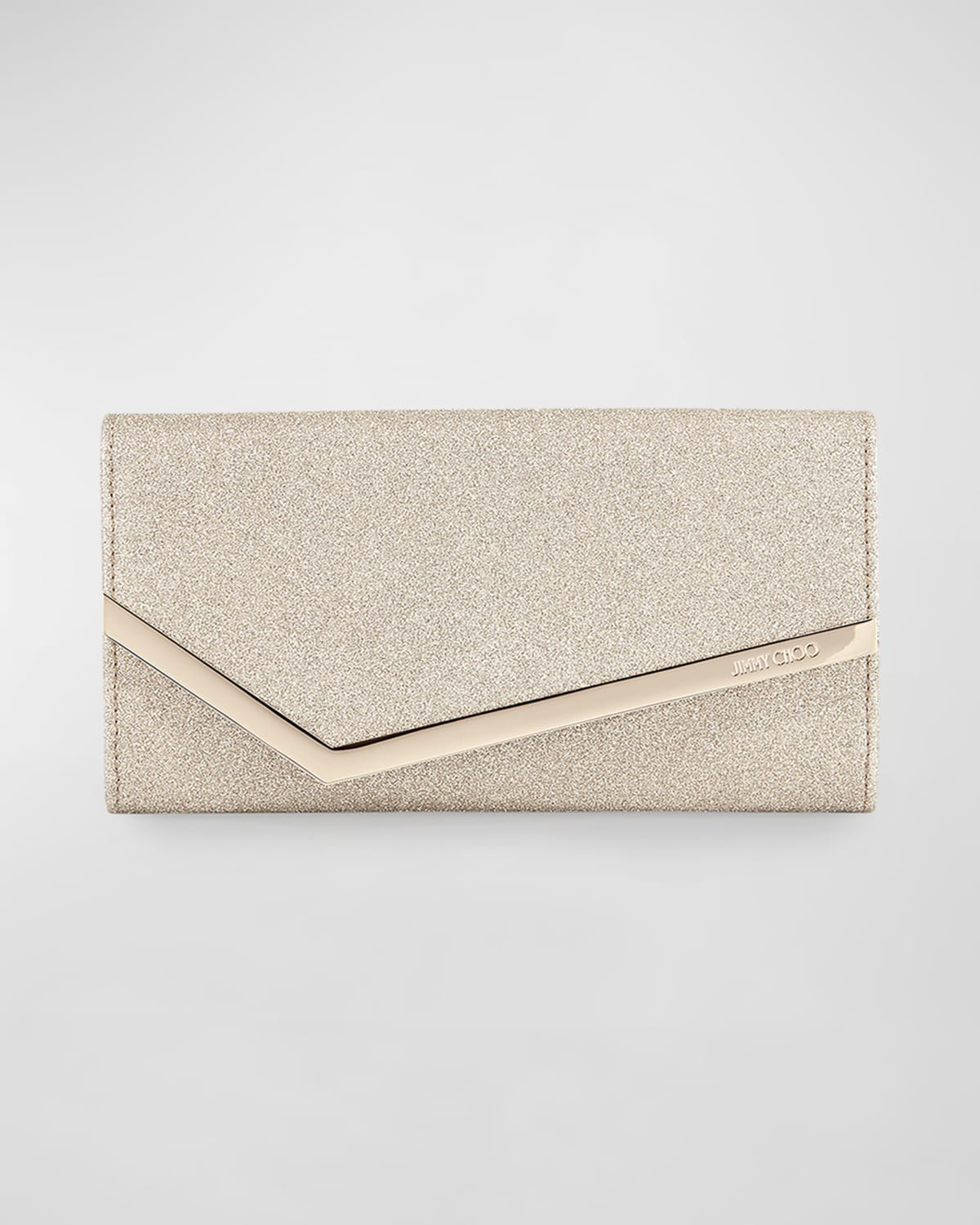 - Jimmy Choo "Emmie" clutch bag in dusty glitter and leather. - Removable chain shoulder strap. - Flap top with snap closure. - Asymmetric logo-engraved metal bar at front. - Interior, leather lining; one zip pocket. - Six card slots. - 4.7"H x 8.7"W x 1.2"D. - Made in Italy.