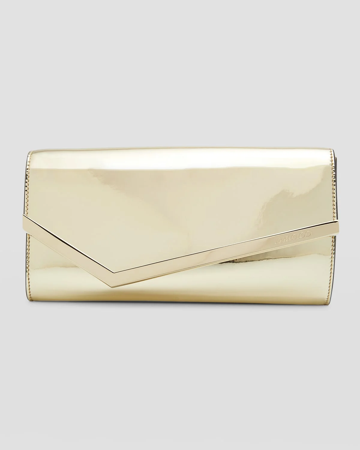 Jimmy Choo "Emmie" clutch bag in metallic leather, cotton, and brass Detachable chain shoulder strap, 23.6"L Can be worn as a clutch or shoulder bag Flap top with magnetic closure Interior, one zip pocket and six card slots Approx. 4.7"H x 8.7"W x 1.2"D Item Weight (Lbs.): 0.9 Made in Italy