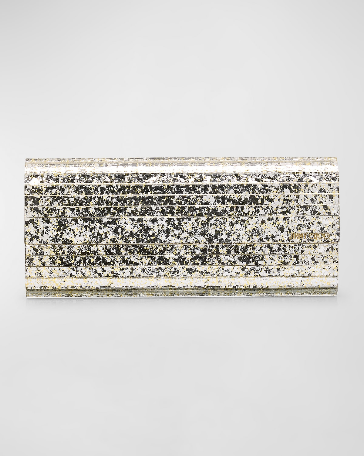 - Jimmy Choo "Sweetie" glittered acrylic clutch bag with golden hardware. - Removable chain shoulder strap, 18" drop. - Flap top with snap closure; embossed logo. - Exterior, metallic leather side panels. - Interior, satin lining; one slip pocket. - 4.5"H x 9.5"W x 1.5"D. - Made in Italy.