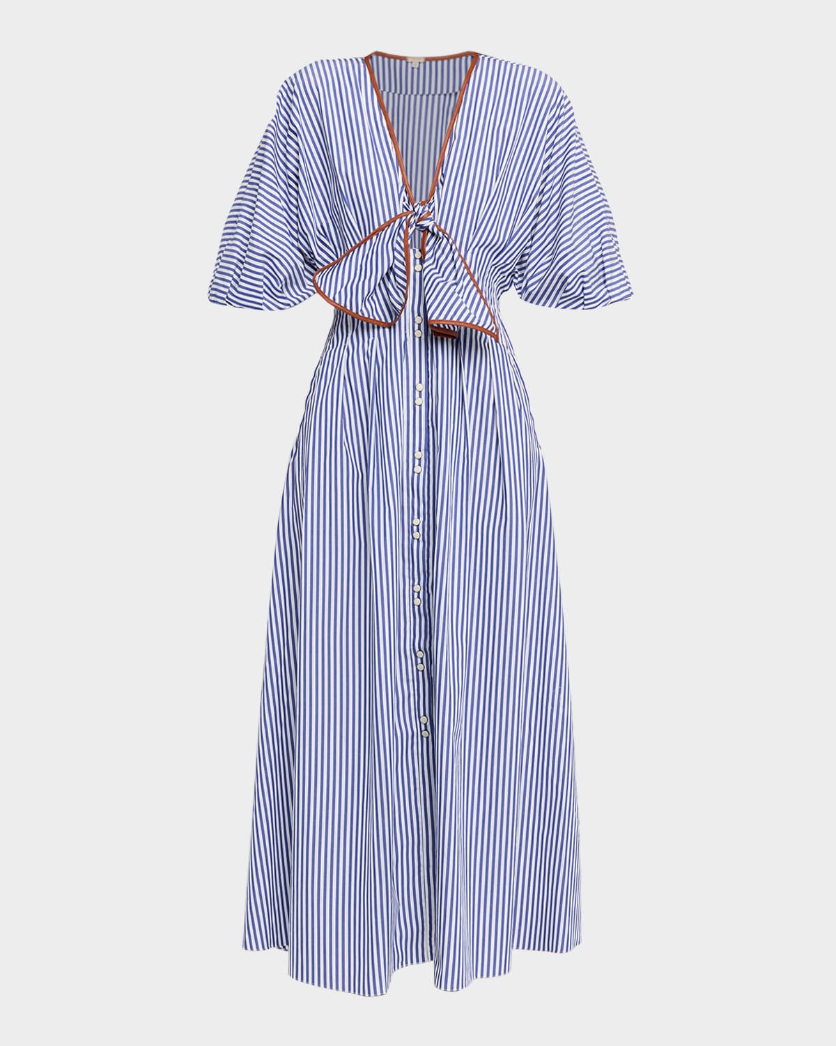 Johanna Ortiz "Endless Spring" dress is crafted from striped cotton with a front bow detail trimmed with leather and a pleated skirt V neckline; button front Short puff sleeves Side split pockets Aline silhouette Ankle length Cotton Made in Colombia