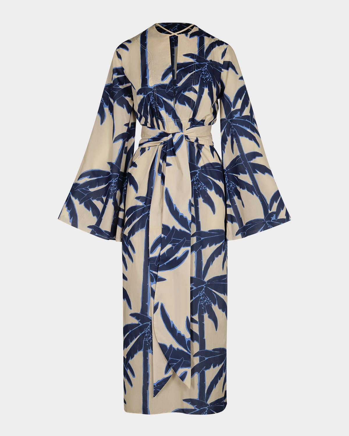 - Johanna Ortiz relaxed tunic dress crafted from light poplin featuring the brand's signature tree motif - Approx. 54"L from shoulder to hem - V neckline - Wide, flowing long-sleeves - Thigh-high side slit - Full length - Relaxed fit - Slipover style - Cotton - Dry clean - Made in Colombia