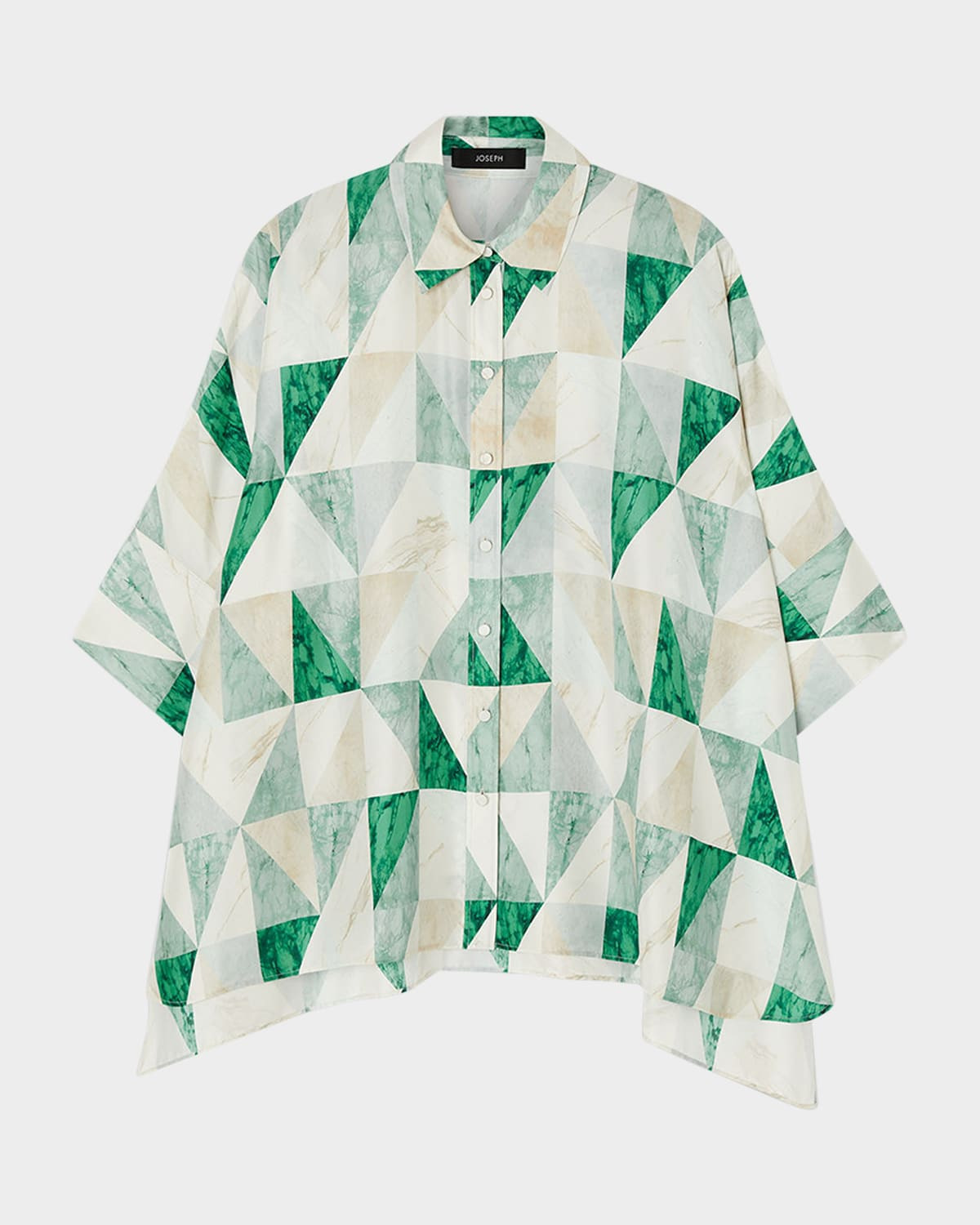 - Joseph "Arcole" blouse in habotai silk features a marbled patchwork quilt print - Point collar; button front - 3/4 sleeves; button cuffs - High-low handkerchief hem - Oversized fit - Silk - Dry clean - Imported
