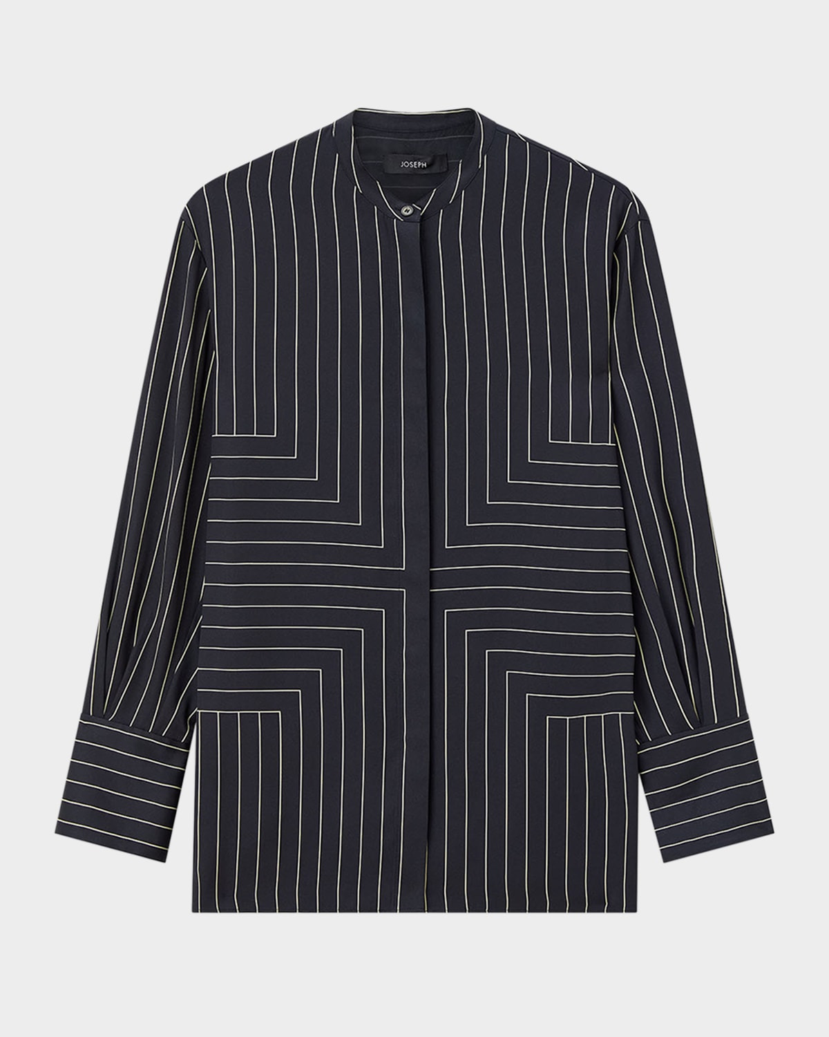 - Crafted in a lustrous and fluid blend of silk and viscose, the "Athena" blouse from Joseph is printed with contrast geometric stripes - Band collar; concealed button front - Long sleeves - Button cuffs - Back yoke - Hem side slits - Relaxed fit - Silk/viscose/spandex - Dry clean - Imported
