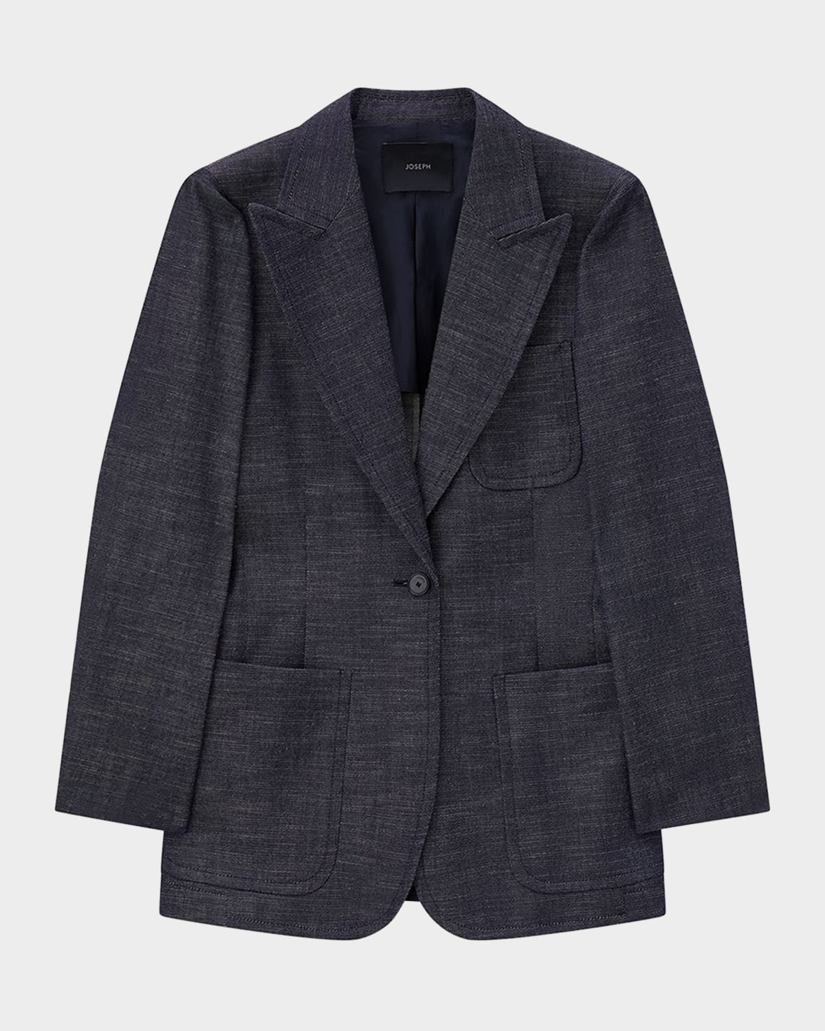 - Joseph "Cassini" jacket made in sartorial denim with a slightly heathered effect - Peak lapels; single-button front - Long sleeves - Four-button cuffs - Front patch pockets - Vertical waist darts - Relaxed fit - Virgin wool/cotton - Lining: Viscose - Dry clean - Made in Portugal