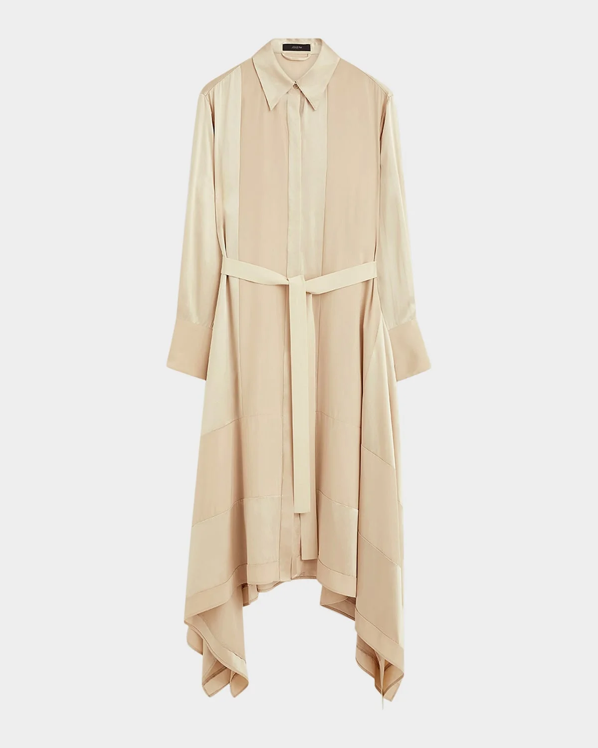 - Joseph "Cyprien" midi shirtdress paneled with matte and shiny satin - Point collar; concealed button front - Long sleeves - Single-button split cuffs - Waist self-tie - Handkerchief hem - Hem falls below the knee - A-line silhouette - Silk - Machine wash cold - Imported