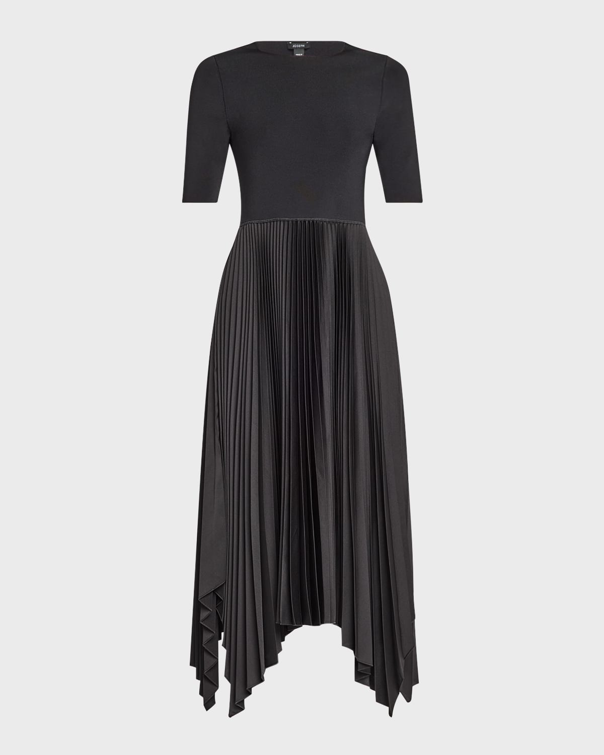 Joseph "Darno" midi dress with knit bodice and pleated skirt Scoop neckline Short sleeves Handkerchief hem Full length Aline silhouette Slipover style Polyester Dry clean Imported