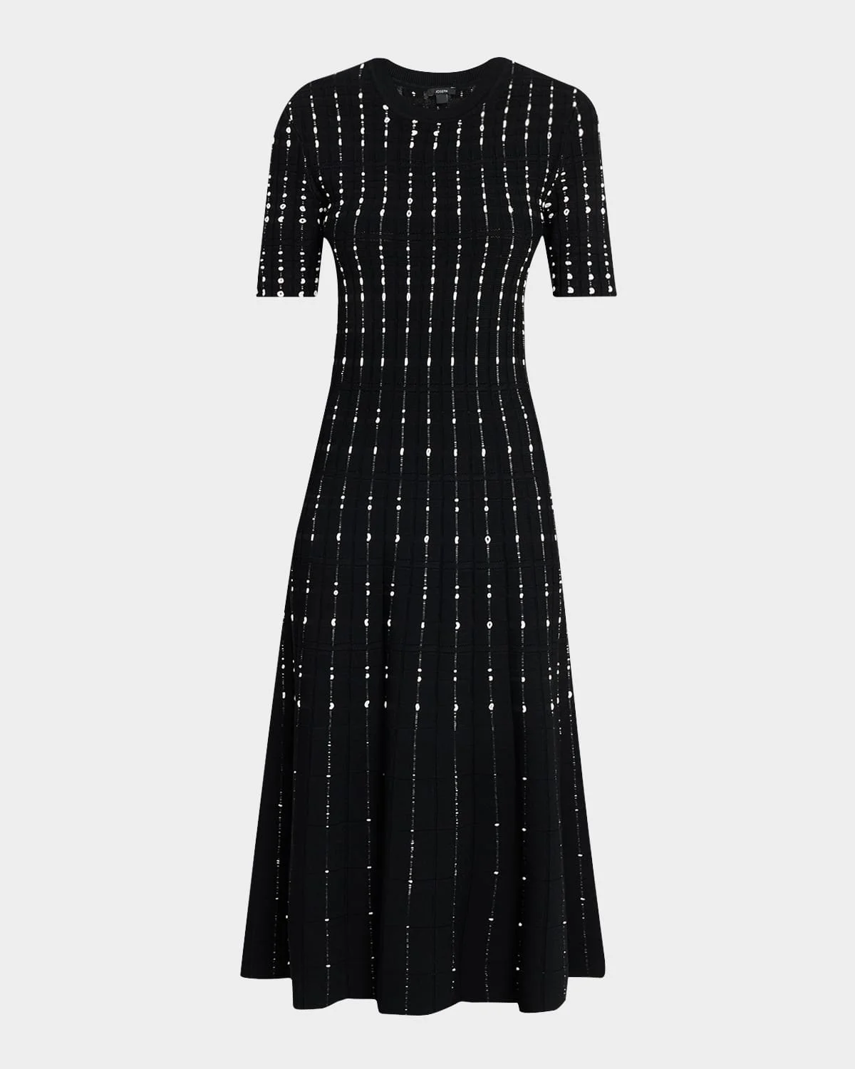 This Joseph midi dress is knit with a dimensional plaid texture, detailed with fragmented stripes for bright contrast Jewel neckline Short sleeves Hem falls below the knee Aline silhouette Slipover style Viscose Dry clean Made in the USA