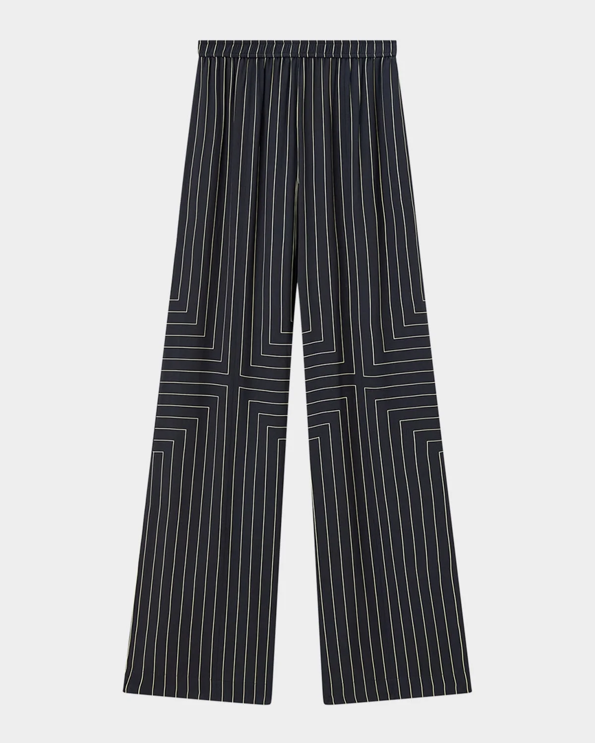 - Crafted of lightweight silk crepe, these fluid "Hulin" trousers from Joseph are printed with contrast geometric stripes - Mid-rise sits high on the hips - Elasticized waistband - Pleated front - On-seam pockets - Full length - Wide legs - Pull-on style - Silk/viscose/spandex - Dry clean - Imported