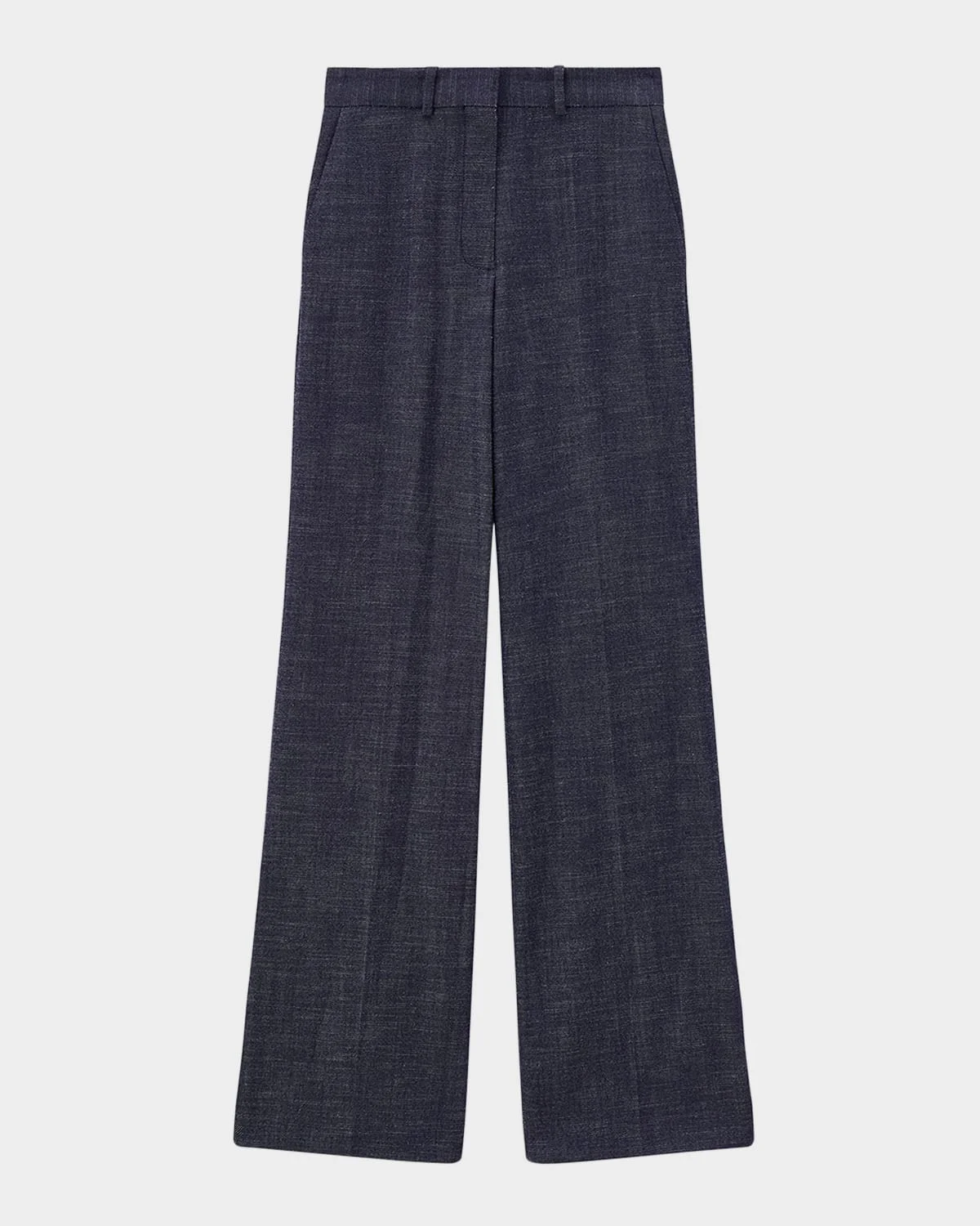 - Joseph "Morissey" pants crafted in sartorial denim with a slightly heathered appearance - Mid-rise sits high on the hips - Flat front - Side slant pockets - Back welt pockets - Full length - Flared legs - Zip fly; belt loops - Virgin wool/cotton - Lining: Viscose - Dry clean - Made in Portugal