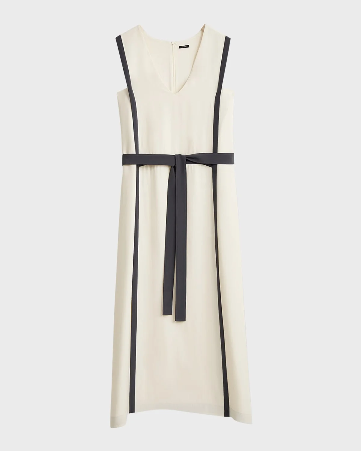 Joseph "Muguet" midi dress in heavy silk crepe with contrast trim Deep V neckline Sleeveless Waist selftie Hem falls below the knee Aline silhouette Invisible back zipper Silk/viscose Dry clean Imported