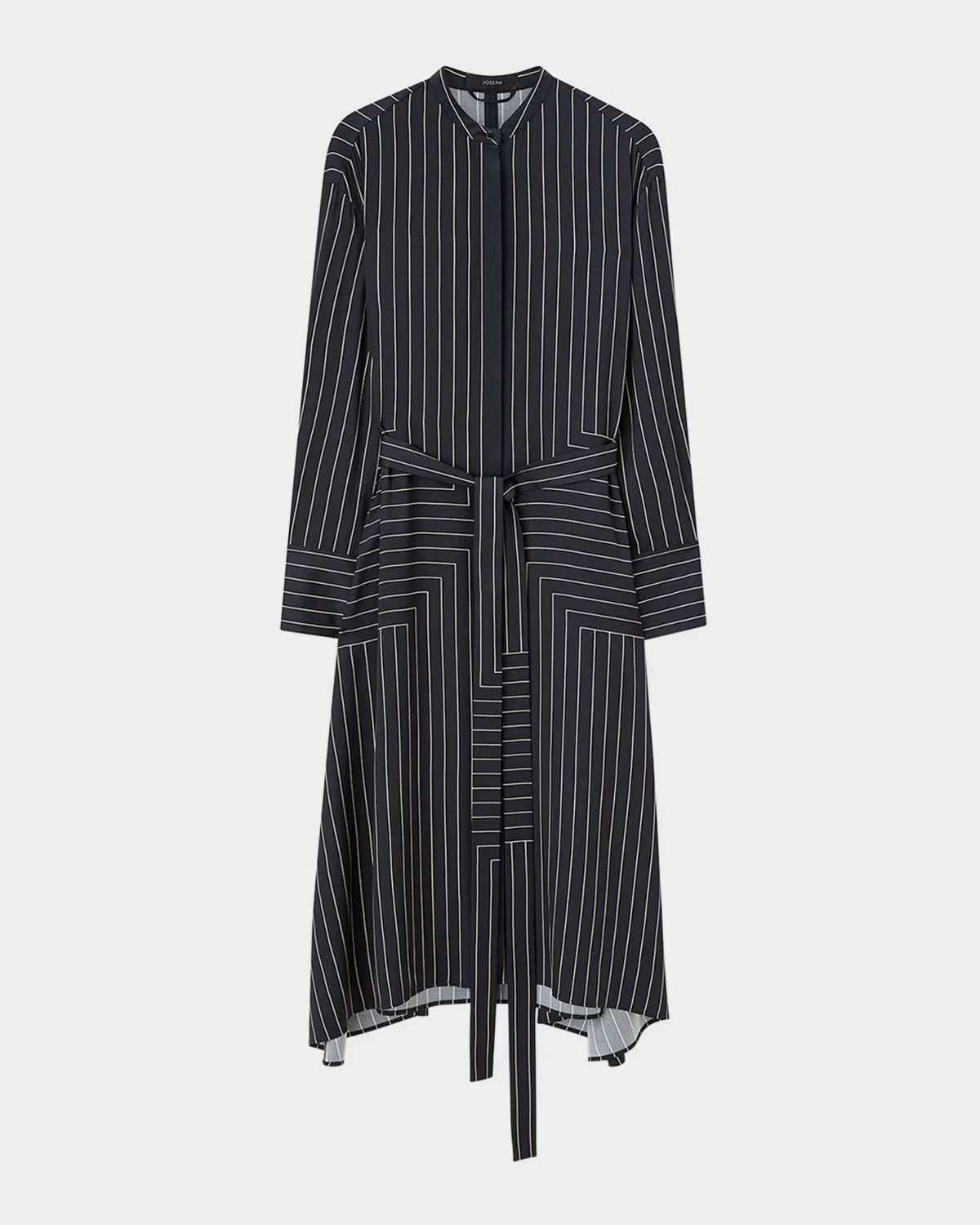 - Printed with geometric stripes, the "Orlana" shirtdress from Joseph is crafted in a blend of silk and viscose with a lustrous, fluid look and feel - Band collar; concealed button front - Long sleeves - Single-button split cuffs - Waist self-tie - On-seam pockets - Side-fall hem - Hem falls below the knee - A-line silhouette - Silk/viscose/spandex - Dry clean - Imported